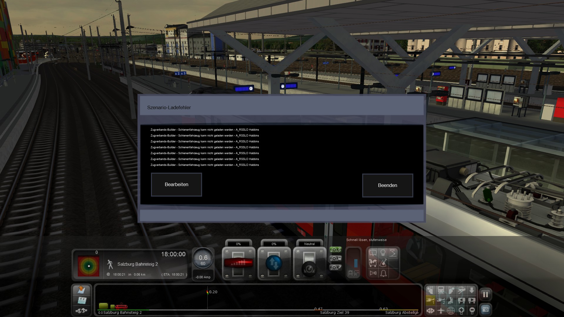 Leider habe ich immer egal welches Szenario auf allen Strecken und Zügen ich spiele, Fehlermeldungen welches das Spiel unspielbar macht da Option bearbeiten oder beenden ist ![]()