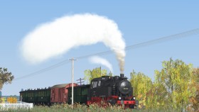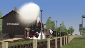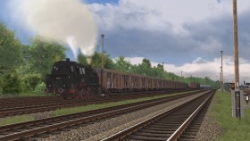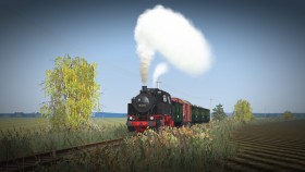 Mit einem schweren Kohlenzug fährt die Reichsbahn 86 1179-0 (fiktive Nummer) durch die schöne Landschaft über die alte Strecke von Triebsees nach Velgast.