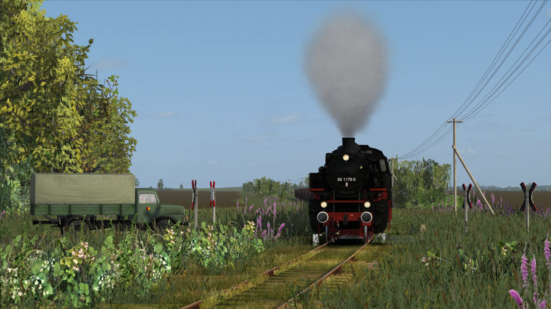 Mit einem schweren Kohlenzug fährt die Reichsbahn 86 1179-0 (fiktive Nummer) durch die schöne Landschaft über die alte Strecke von Triebsees nach Velgast.