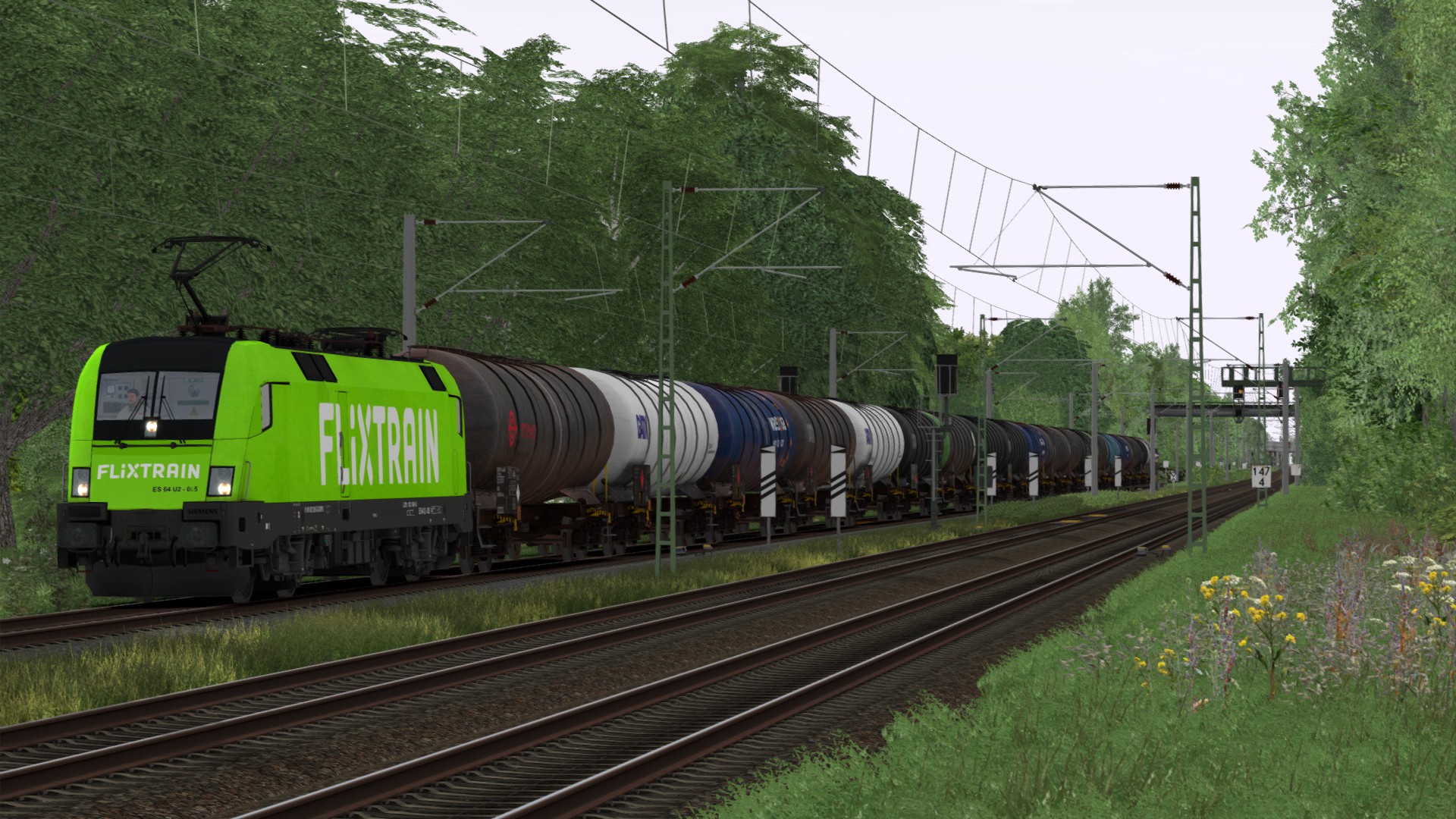 Vectron mit Tanktainern von Kehl nach Karlsruhe. (Das Szenario endet kurz danach mit einer Kollision, frage mich grad warum ich auf dem Gegengleis fahre. Nur die Lok getauscht