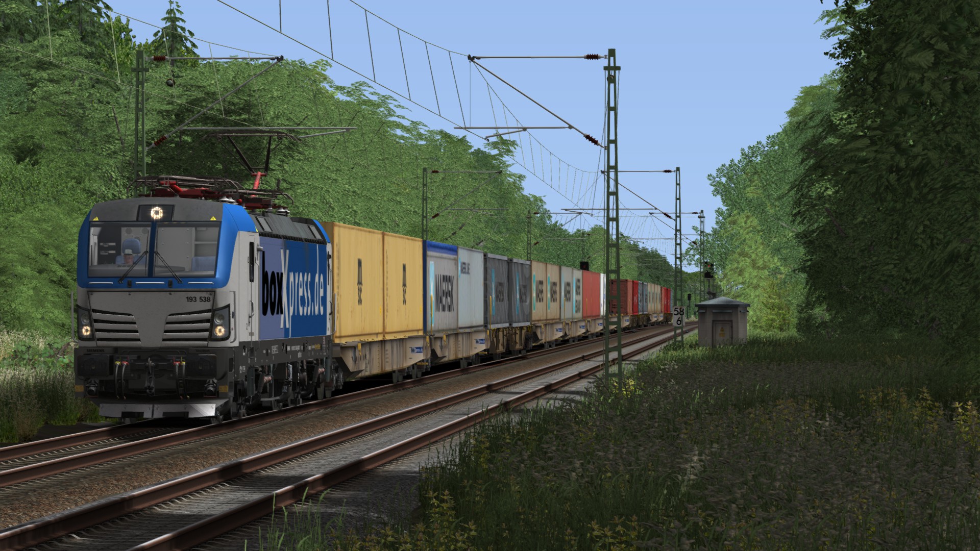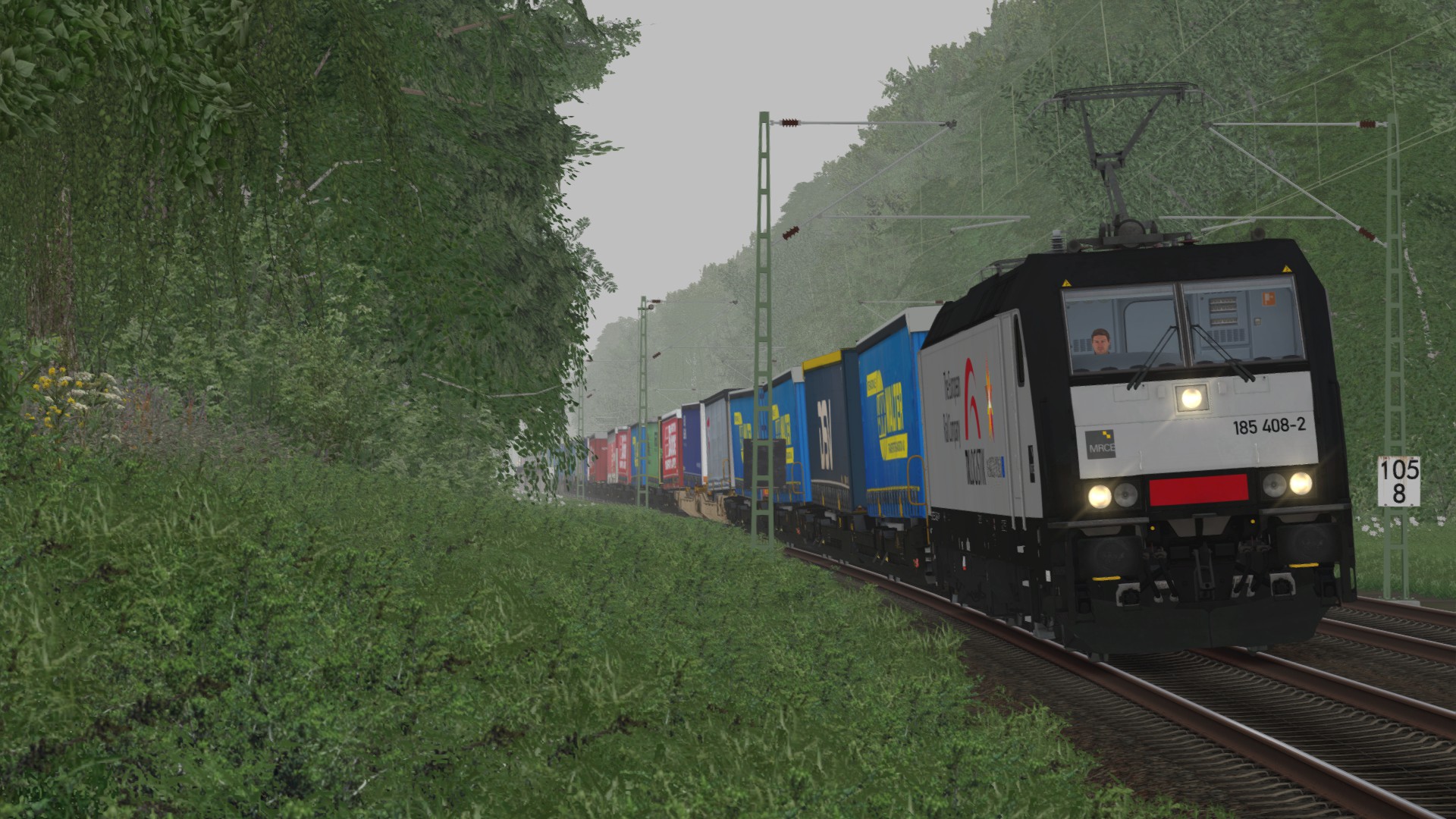 Vectron mit Tanktainern von Kehl nach Karlsruhe. (Das Szenario endet kurz danach mit einer Kollision, frage mich grad warum ich auf dem Gegengleis fahre. Nur die Lok getauscht