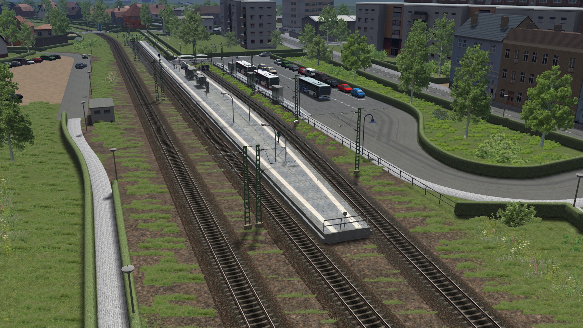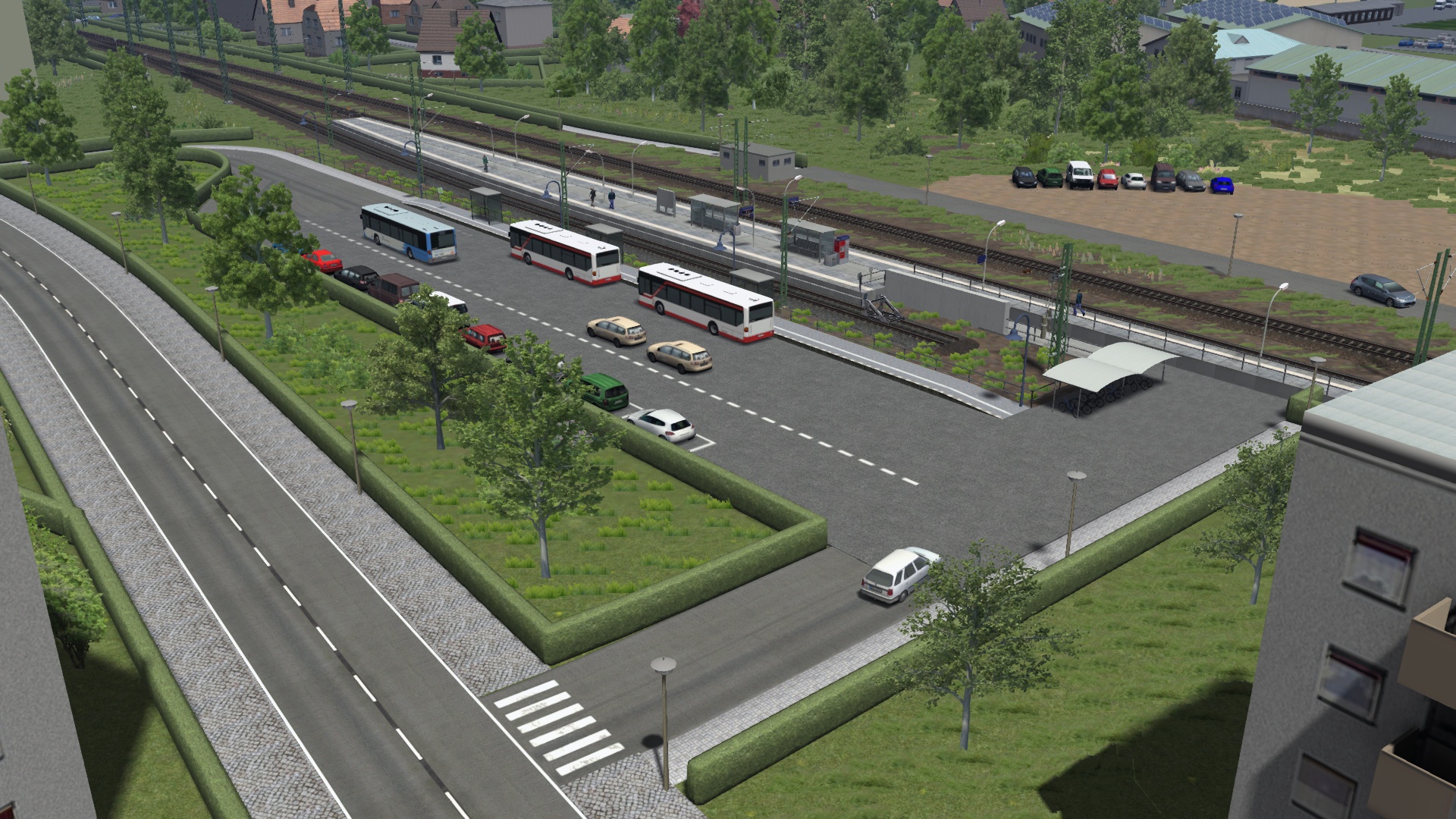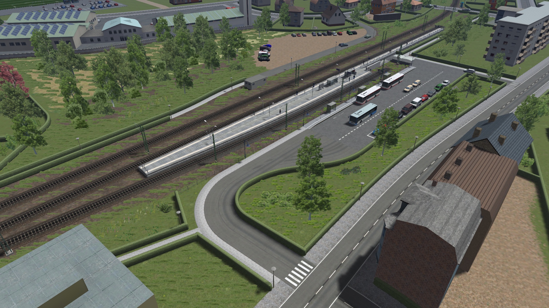 Gestern und heute habe ich den Bahnhof Schwedt (Oder) umgekrempelt und nun ist er so aufgebaut, dass das Durchgangsgleis zum Gewerbepark nicht mehr gleichzeitig Haltegleis für endende Personenzüge ist. Das erhöht die betriebliche Flexibilität und Erreichbarkeit des Gewerbeparks deutlich. Außerdem habe ich das selbstverschuldete Problem des Bahnsteigwechsels beim alten Bahnhof beheben können. Die zuvor existierenden zwei Außenbahnsteige hatte ich nämlich nicht direkt verbunden, und die simulierten Fahrgäste hatten einen umständlichen Fußweg über die nächstgelegenen BÜs nehmen müssen. Damit ist jetzt Schluss: beide Kopfgleise befinden sich an einem Bahnsteig, der direkt vom neu verbesserten Bahnhofsvorplatz erreicht werden kann. Am gekrümmten, kürzeren Bahnsteig enden die RBs aus Richtung Bad Freienwalde, am längeren, geraden Bahnsteig die S-Bahnen aus Tannenberg.