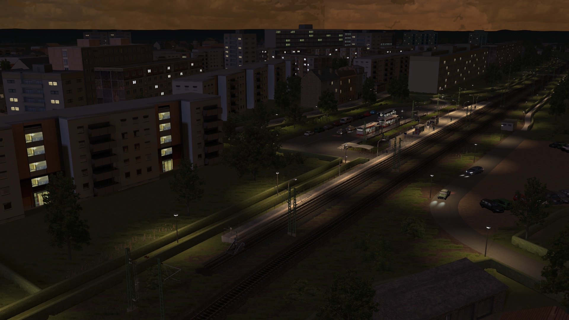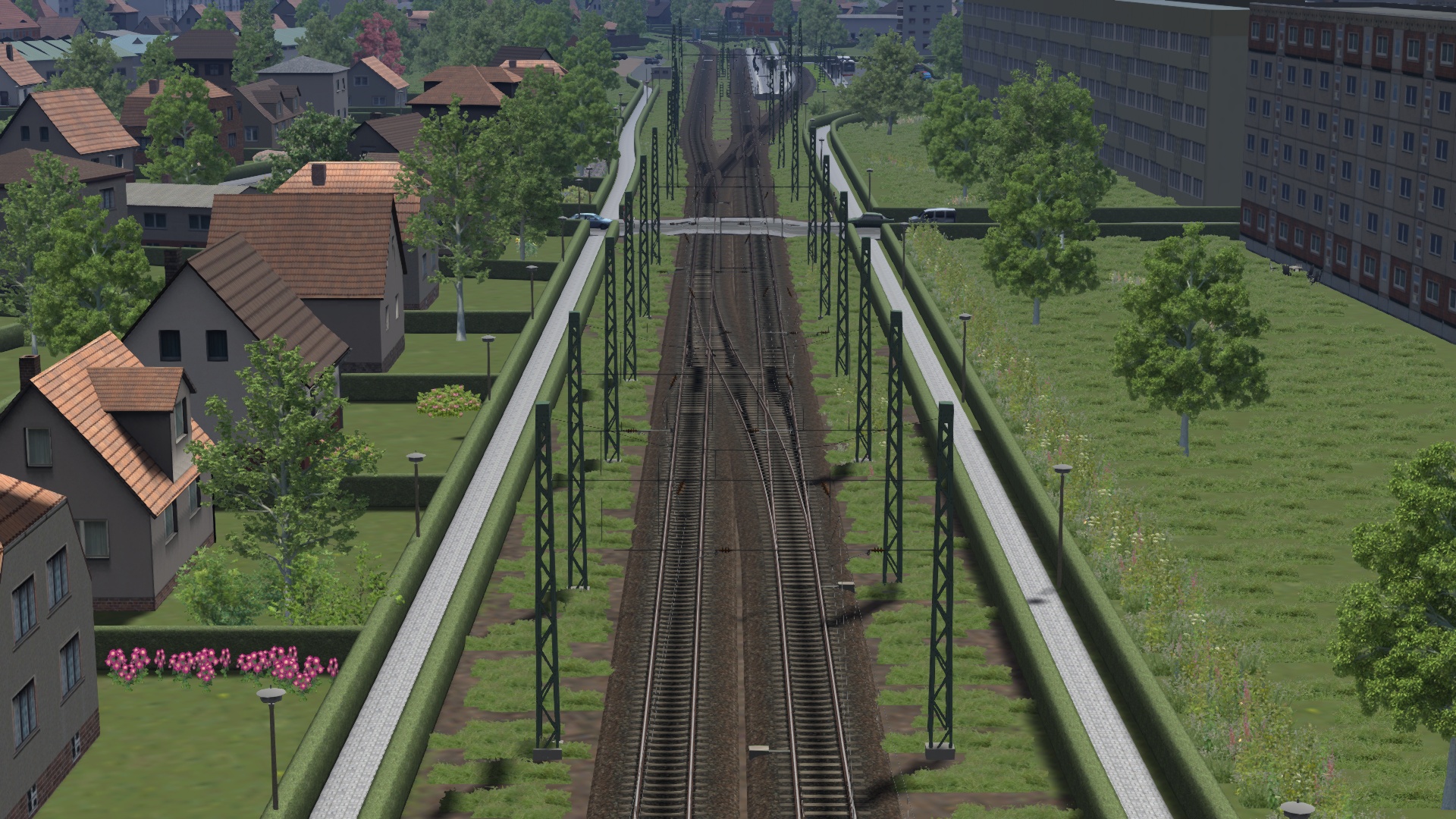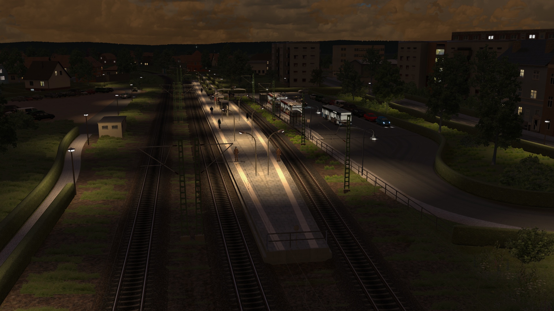 Gestern und heute habe ich den Bahnhof Schwedt (Oder) umgekrempelt und nun ist er so aufgebaut, dass das Durchgangsgleis zum Gewerbepark nicht mehr gleichzeitig Haltegleis für endende Personenzüge ist. Das erhöht die betriebliche Flexibilität und Erreichbarkeit des Gewerbeparks deutlich. Außerdem habe ich das selbstverschuldete Problem des Bahnsteigwechsels beim alten Bahnhof beheben können. Die zuvor existierenden zwei Außenbahnsteige hatte ich nämlich nicht direkt verbunden, und die simulierten Fahrgäste hatten einen umständlichen Fußweg über die nächstgelegenen BÜs nehmen müssen. Damit ist jetzt Schluss: beide Kopfgleise befinden sich an einem Bahnsteig, der direkt vom neu verbesserten Bahnhofsvorplatz erreicht werden kann. Am gekrümmten, kürzeren Bahnsteig enden die RBs aus Richtung Bad Freienwalde, am längeren, geraden Bahnsteig die S-Bahnen aus Tannenberg.
