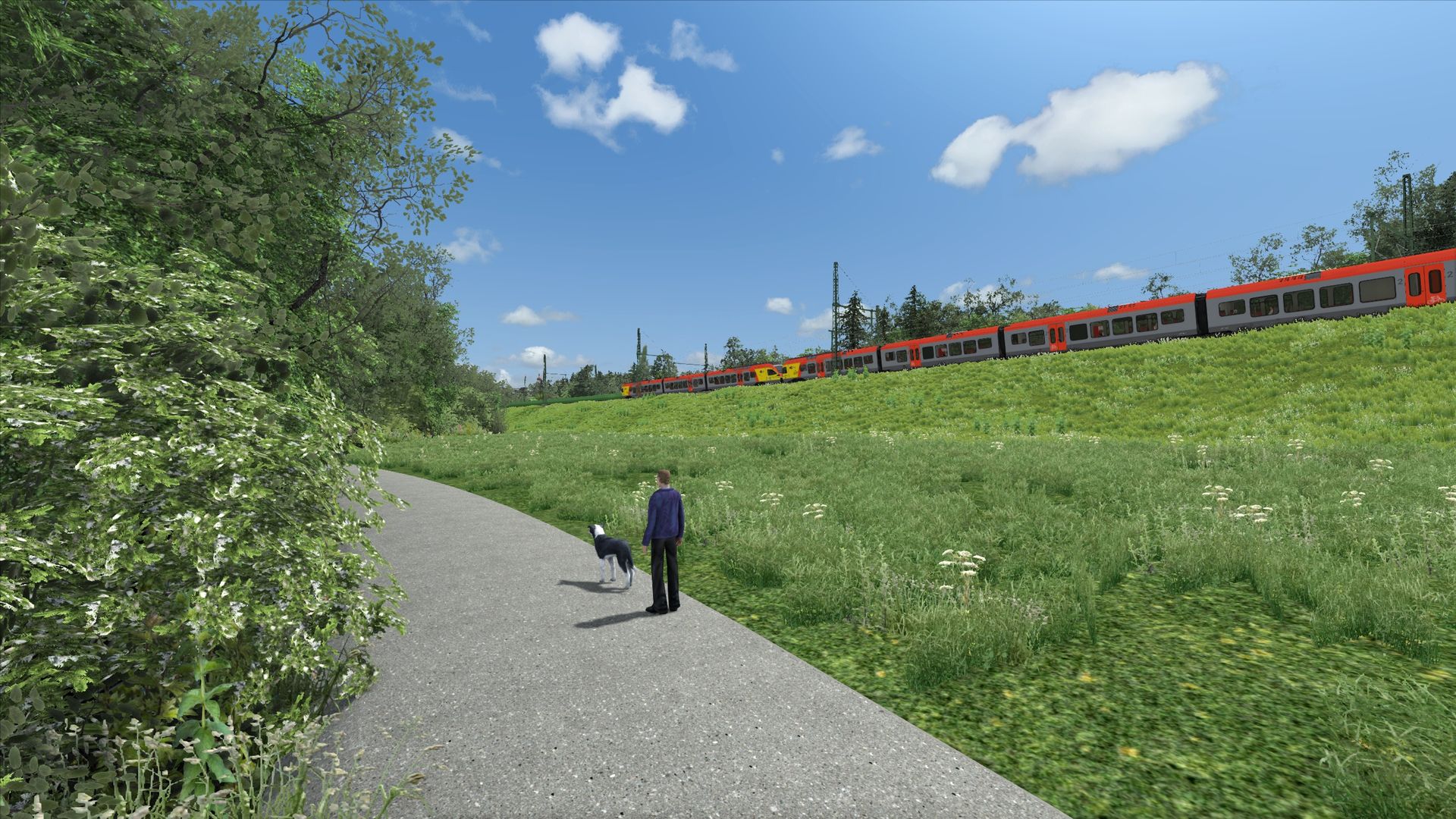 Ich würde fast sagen, dass dies der bisher anspruchsvollste Abschnitt gewesen ist. Die Strecke verläuft dort ein wenig in Hanglage in einem großen Bogen, wodurch man gerade auch auf der Fernbahn doch recht weit sehen kann. Ich will gar nicht wissen wieviele Stunden ich mit Terraforming verbracht habe... Viele davon auch um den Bahndamm gescheit bepflanzen zu können und die Hanglage mit den entsprechenden Höhen richtig darzustellen
