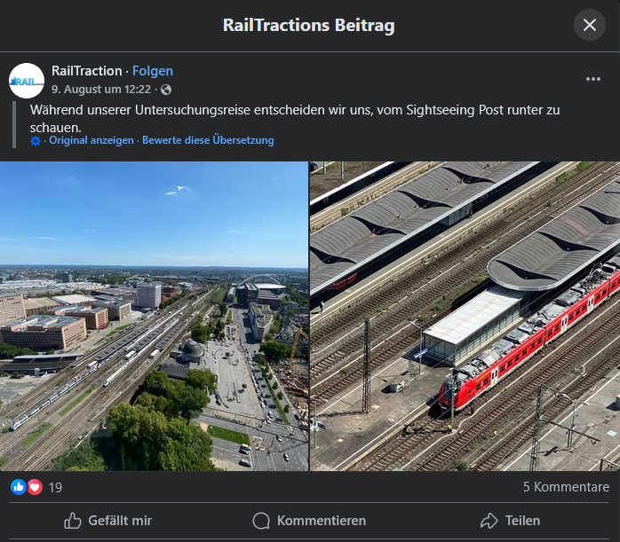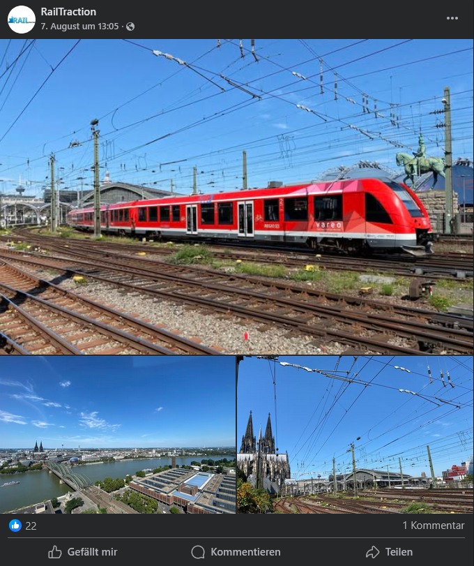Gepostet wurde ein Luftbild des Bahnhofs Köln Messe/Deutz sowie eine nähere Aufnahme eines Triebzuges der Baureihe 1440. Bereits in den Tagen zuvor wurden mehrere Bilder aus dem Bahnknoten Köln sowie aus Duisburg gepostet. Ob da etwas in Entwicklung ist? ![]()