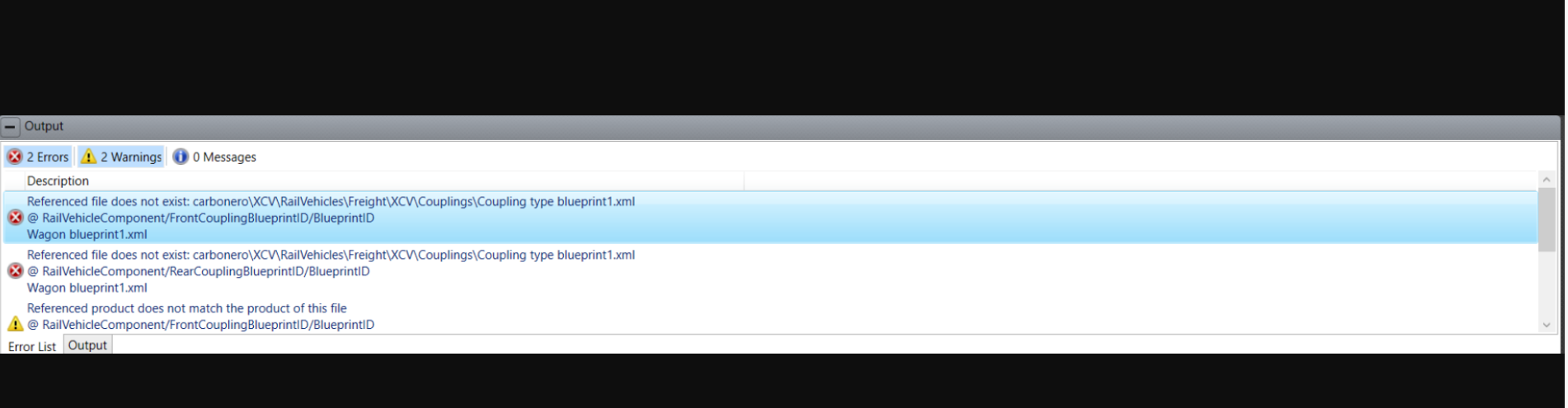 In der Datei "Wagon blueprint1.xml" hast Du die Datei verlinkt, beim Feld "FrontCoupling" und "RearCoupking". Eventuell hast Du die Datei "Coupling type bluebprint1.xml" verschoben und musst die Verlinkung in der Datei "Wagon blueprint1.xml" anpassen.