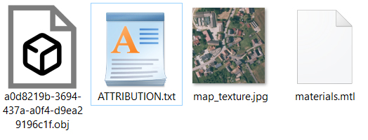 Die Datei aus dem 3DCityLoader wird gepackt als zip-Datei zur Verfügung gestellt. Nach dem Entpacken gibt es die obj-Datei, die ATTRIBUTION.txt mit den Angaben für die Lizenzen, die map_texture.jpg mit dem Luftbild für die Geländedaten und die materials.mtl mit Informationen für die Texturen. Die Datei materials.mtl lässt sich mit einem Texteditor (z.B. Notepad) öffnen. Es gibt in der Datei also das Material terrain_material mit der Textur map_texture.jpg und das Material buildings_material. Die Angabe Kd steht für eine diffuse Farbe nach dem Schema rot-grün-blau. Dabei bedeutet 0.7 0.7 0.7 einen Grau-Wert. Die Angabe Ks steht für Specular Reflectance, also der Intensität eines Glanzlichts.