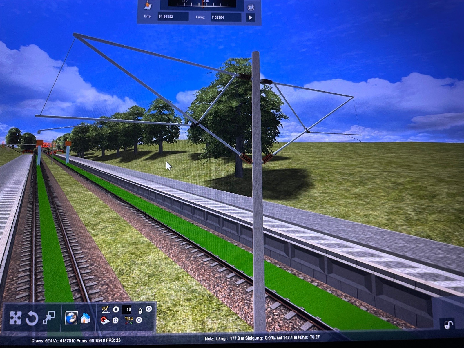 • Zunächst mal wäre es sehr gut, wenn du ingame deine Screenshots aufnehmen würdest. Dieses abfotografieren des Monitors ist semi-gut. Dann solltest du am besten (meine Meinung) die TSC Oberleitung nutzen. Ich meine auch mal gelesen zu haben, das es bei der RLB Oberleitung Probleme mit der Erlaubnis bezüglich einer Verwendung auch im Freeware Bereich geben kann (da bin ich aber nicht sicher). Dann die Frage, sind denn die Masten passend zum Fahrdraht? Also gehört beides zu RLB?