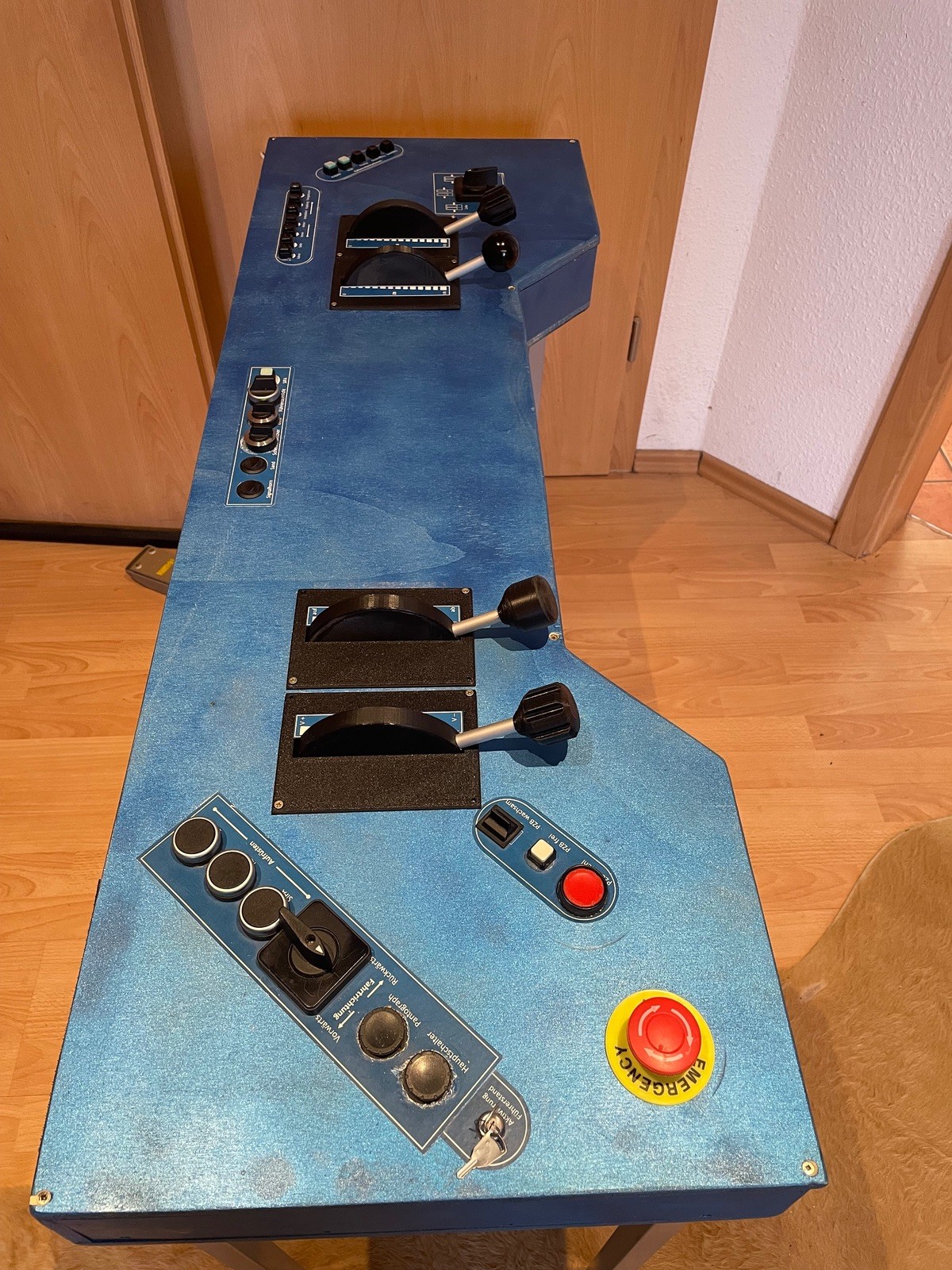 Hier einfach mal mein komplett selbst gebautes Bahncockpit mit USB Anschluss. Die „Joysticks“ (AFB, Fahr-Bremshebel) haben Inkrementalgeber verbaut und sind mit 3D Drucker erstellt. Steuerung über Arduino. Der Rest einfach Schalter …ja ein wenig Sammelsurium 😉