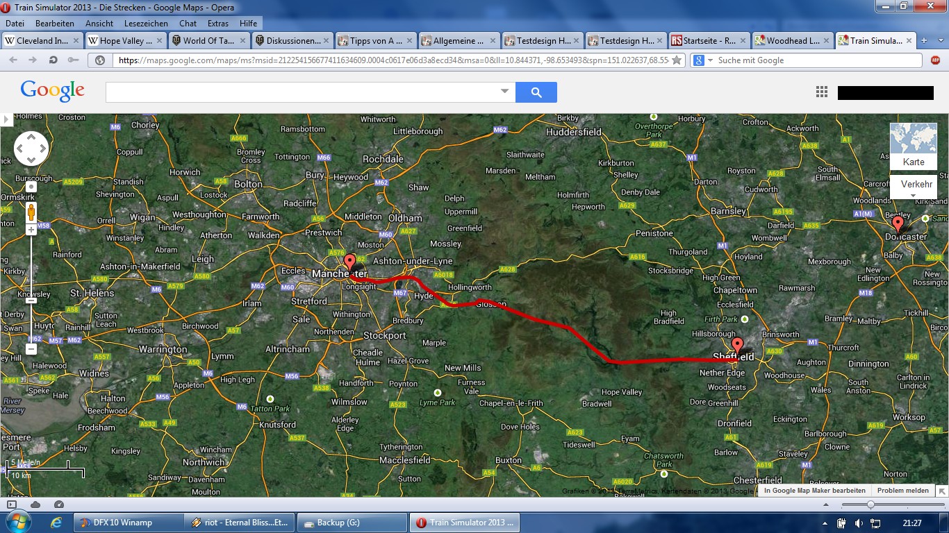 Ein kleiner Fehler ist mir aber aufgefallen: Die Woodhead Line ist falsch eingezeichnet. Diese verlief ein gutes Stück weiter nördlich via Penistone. Als Vergleich dazu zwei Bilder, einmal der falsche Streckenverlauf aus dem Link auf Seite 1, darunter der korrekte Streckenverlauf. Hier der passende Link zu Google Maps.