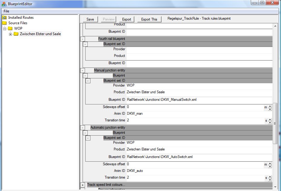 Alles anzeigen<ManualJunctionEntity> <iTrackRulesBlueprint-sPatternEntityDesc> <Blueprint> <iBlueprintLibrary-cAbsoluteBlueprintID> <BlueprintSetID> <iBlueprintLibrary-cBlueprintSetID> <Provider d:type="cDeltaString">WOP</Provider> <Product d:type="cDeltaString">Zwischen Elster und Saale</Product> </iBlueprintLibrary-cBlueprintSetID> </BlueprintSetID> <BlueprintID d:type="cDeltaString">RailNetwork\Junctions\DKW_ManualSwitch.xml</BlueprintID> </iBlueprintLibrary-cAbsoluteBlueprintID> </Blueprint> <SidewaysOffset d:type="sFloat32" d:alt_encoding="0000000000000000" d:precision="string">0</SidewaysOffset> <AnimID d:type="cDeltaString">DKW_Man</AnimID> <TransitionTime d:type="sFloat32" d:alt_encoding="0000000000000040" d:precision="string">2</TransitionTime> </iTrackRulesBlueprint-sPatternEntityDesc> </ManualJunctionEntity> <AutomaticJunctionEntity> <iTrackRulesBlueprint-sPatternEntityDesc> <Blueprint> <iBlueprintLibrary-cAbsoluteBlueprintID> <BlueprintSetID> <iBlueprintLibrary-cBlueprintSetID> <Provider d:type="cDeltaString">WOP</Provider> <Product d:type="cDeltaString">Zwischen Elster und Saale</Product> </iBlueprintLibrary-cBlueprintSetID> </BlueprintSetID> <BlueprintID d:type="cDeltaString">RailNetwork\Junctions\DKW_AutoSwitch.xml</BlueprintID> </iBlueprintLibrary-cAbsoluteBlueprintID> </Blueprint> <SidewaysOffset d:type="sFloat32" d:alt_encoding="0000000000000000" d:precision="string">0</SidewaysOffset> <AnimID d:type="cDeltaString">DKW_auto</AnimID> <TransitionTime d:type="sFloat32" d:alt_encoding="0000000000000040" d:precision="string">2</TransitionTime> </iTrackRulesBlueprint-sPatternEntityDesc> </AutomaticJunctionEntity>Leider wird mir aber kein Fahrtweg angezeigt. Es bewegt sich nix ... Vielleicht ist da irgendwo nen Fehler in meiner Rule?