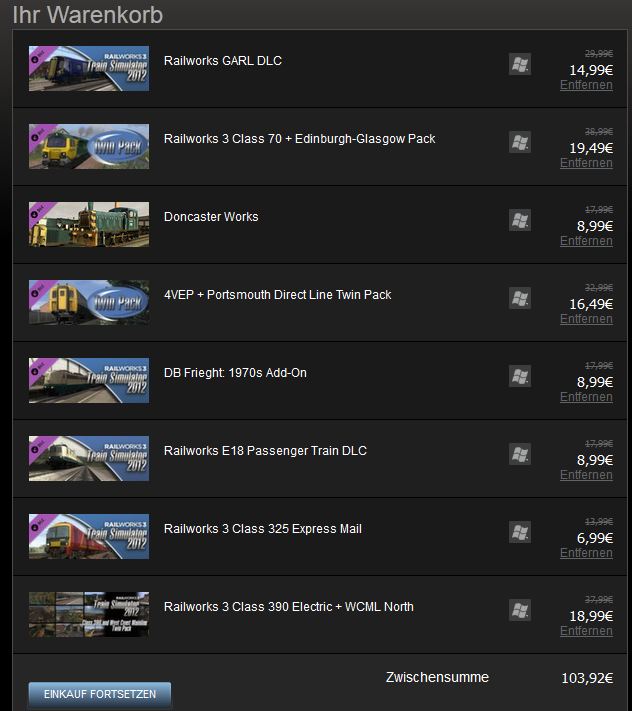• also NEC läuft bei mir nicht ordentlich, das war ein Fehlkauf bei der letzten Steam Sonderaktion. Übrigens lohnt es sich bei dieser Aktion auch die Loks anzuschauen bezw. deren mitgelieferten Szenarien, ich hab mir z.B. die Class 66 gekauft, da sind 11 Szenarien dabei, wenn ich nun rechne was ich alleine sonst für die Szenarien zahle sind diese 5,99 ja doch recht günstig, hinzu kommt dass diese englische Lok an Szenarien auf deutschen Strecken dabei hat...und die Lok macht Spaß, ist aber noch Railwork 2.