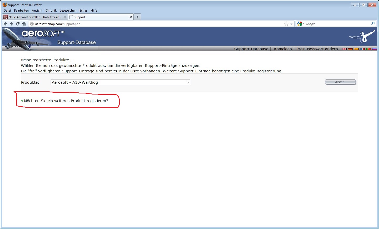 da gibts dann ne Auswahl der registrierten Produkte, und die Option "weiteres Produkt registrieren", wo man auch Box-Versionen angeben kann.