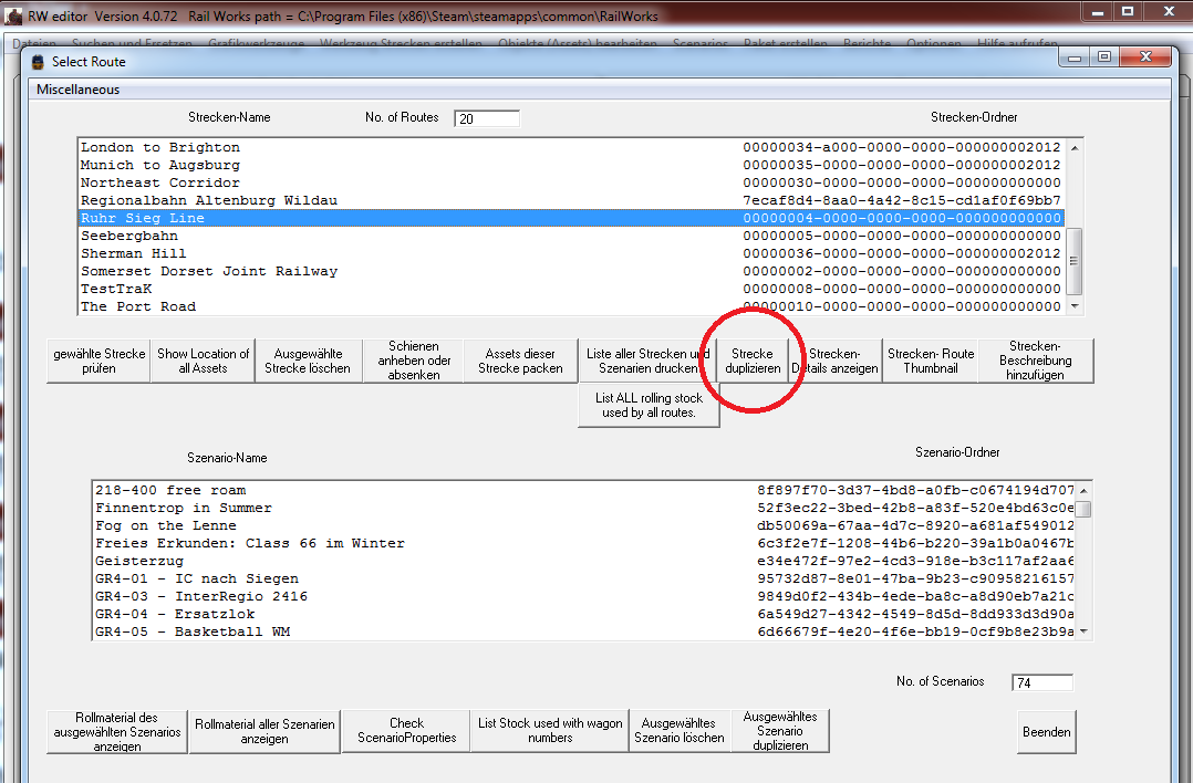 Über RW Tools 4.0.72 habe ich die Ruhr Sieg Line dupliziert. (Siehe Printscreen) Ich habe einen Ordner ausshalb von Railworks gewählt.