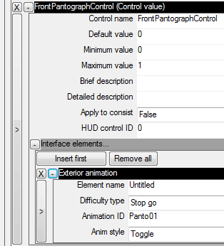 3. Die Animation muss dann in den [Control Container > Control Values] in den Controls FrontPantographControl und RearPantographControl verknüpft werden