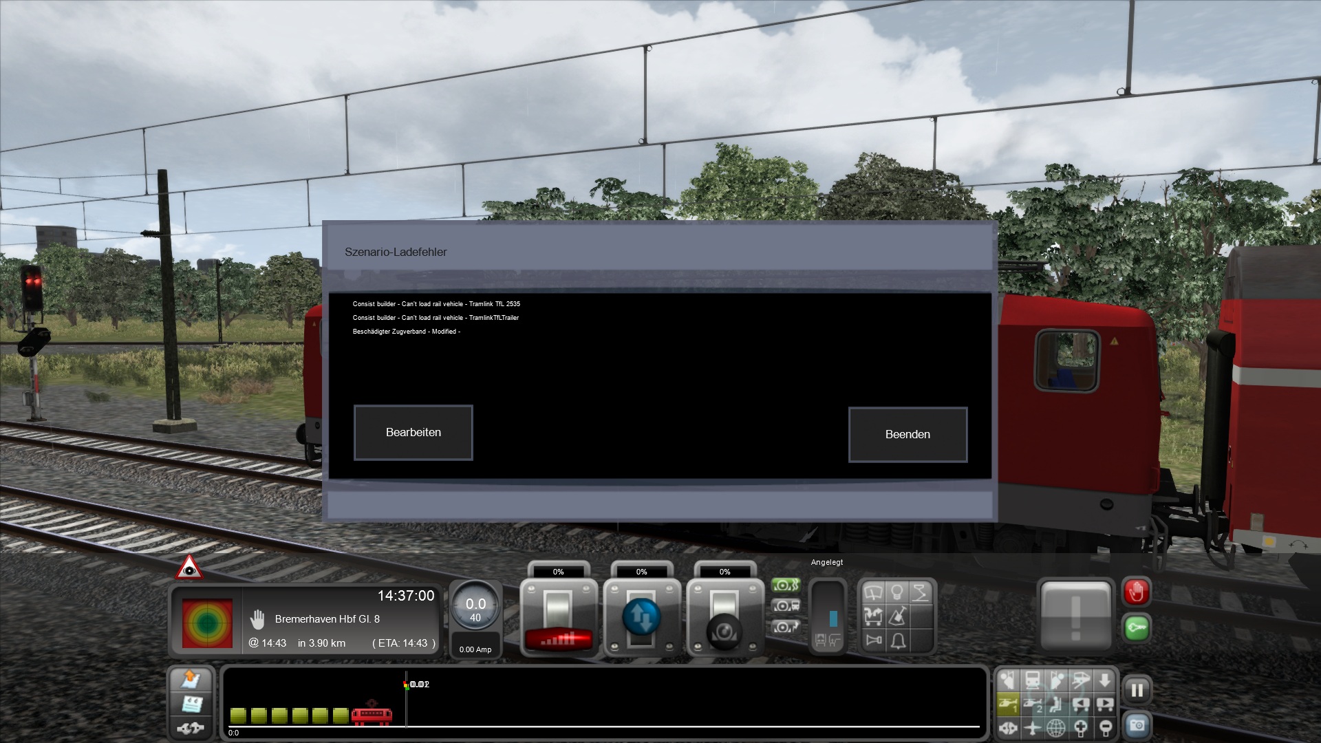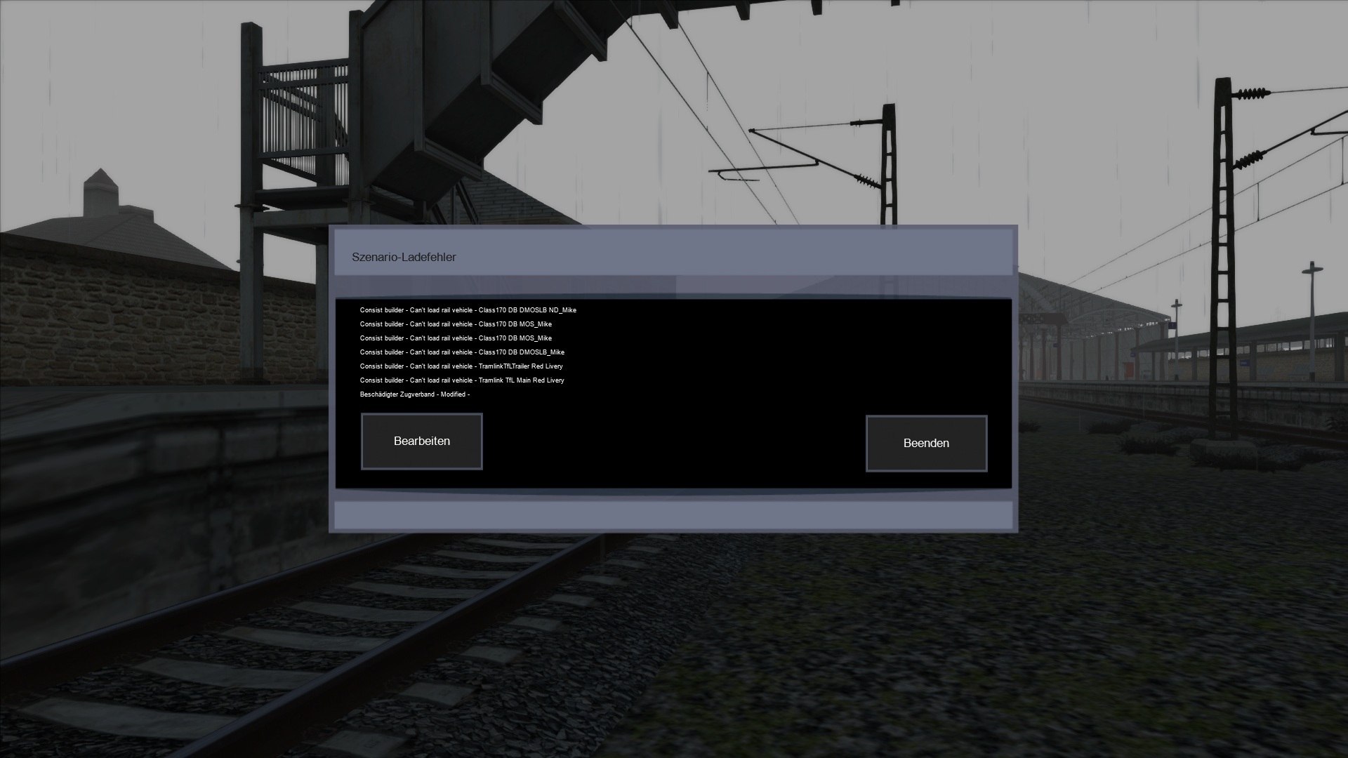 habe EWD nach Anleitung installiert. Bis auf Szenario 2.2 RegioExpress Cuxhaven und 2.5 Flughafenservice werden alle anderen Szenarios geladen. Es kommen immer die Fehlermeldungen siehe Dateianhang. Beim Flughafenservice erst die Meldung: Fortsetzen ja/nein und dann Szenario Ladefehler. Class 170 ist