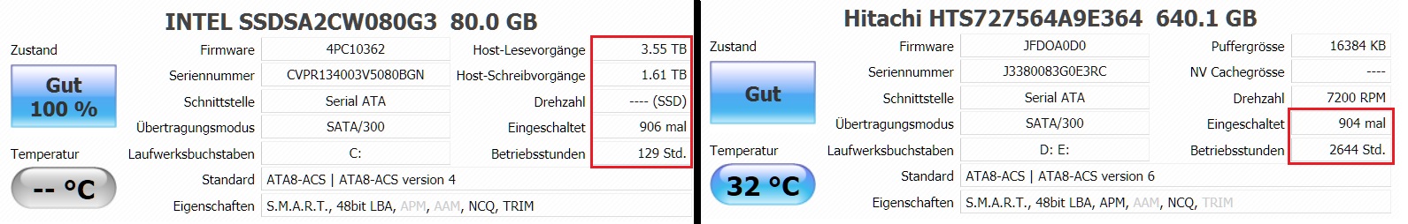 Mein Notebook ist nun 1 Jahr und 3 Monate und läuft fast täglich. Links SSD mit Win7, rechts die zweite Platte (HDD).