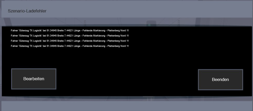 Die kann man auch mit ESC wegdrücken und die Fahrt beginnt auch ganz normal. Nur wieso kommt die Fehlermeldung? Die Markierung im Szenarioeditor ist da. Zumindest kann ich Sie als Ziel anwählen.