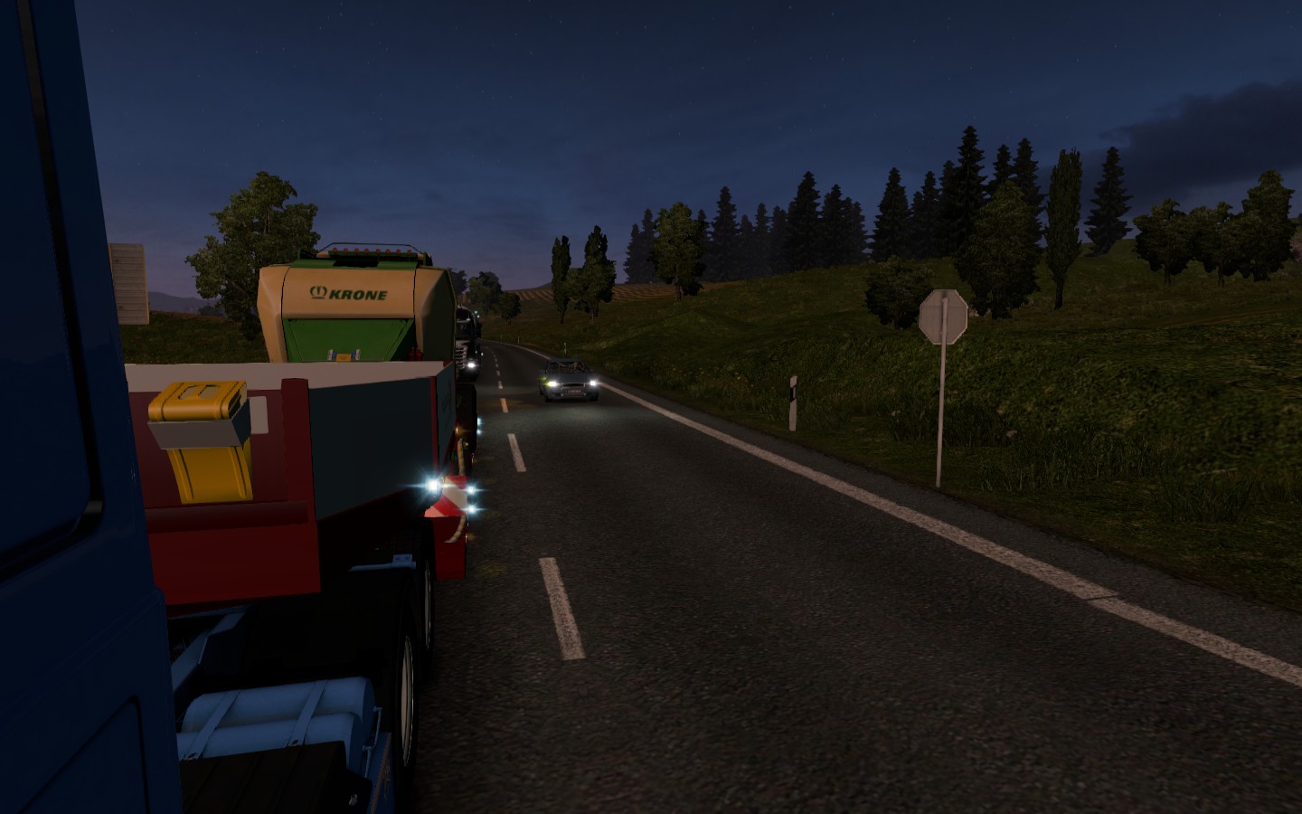 1. Bild zeigt den schlauen KI-Verkehr, welcher eigentlich auf der gesamten Landstraße überholen wollte aber zieht man einmal ausversehen bisschen nach Links bremst er wieder ab