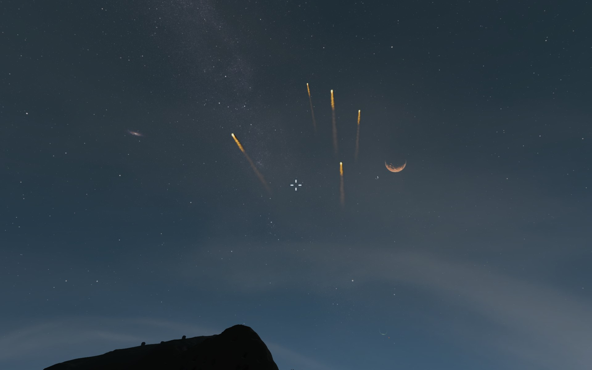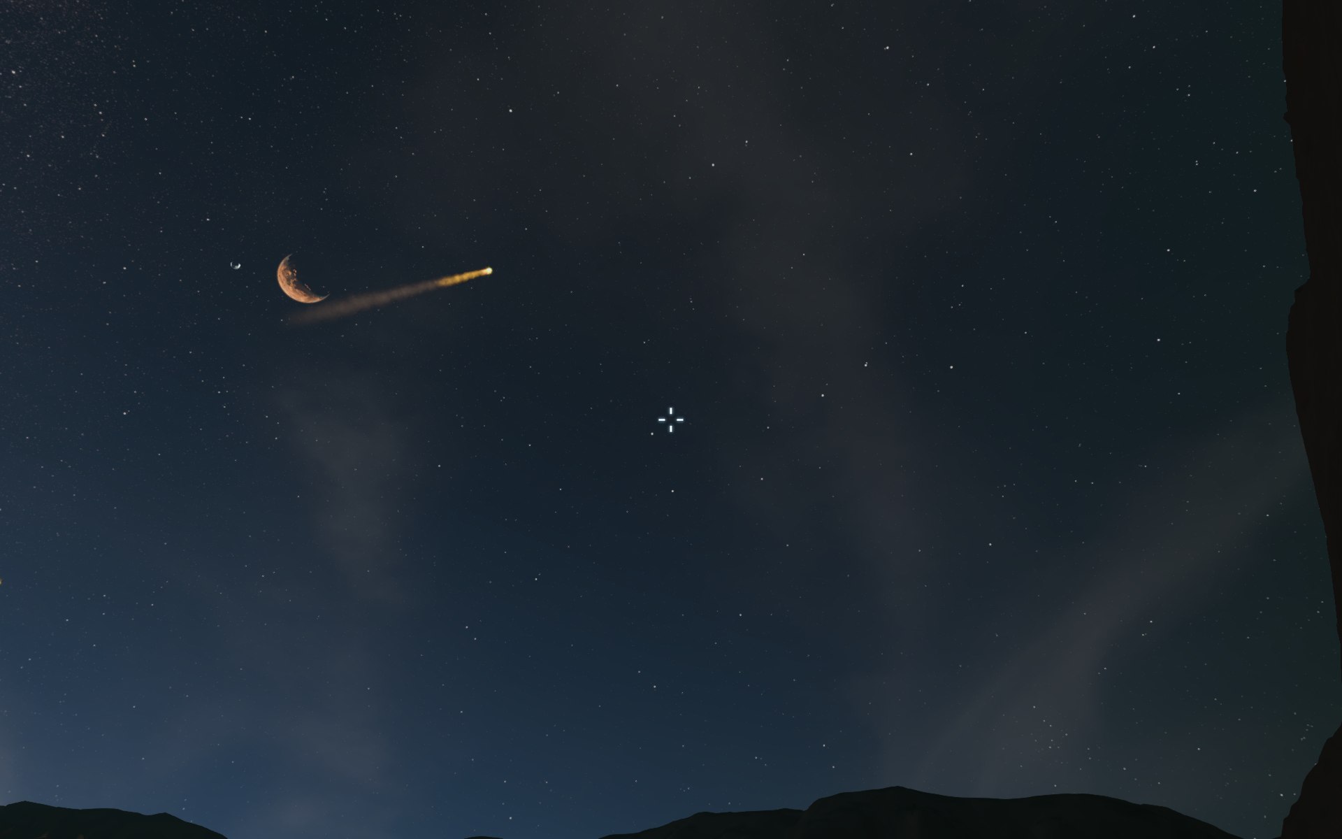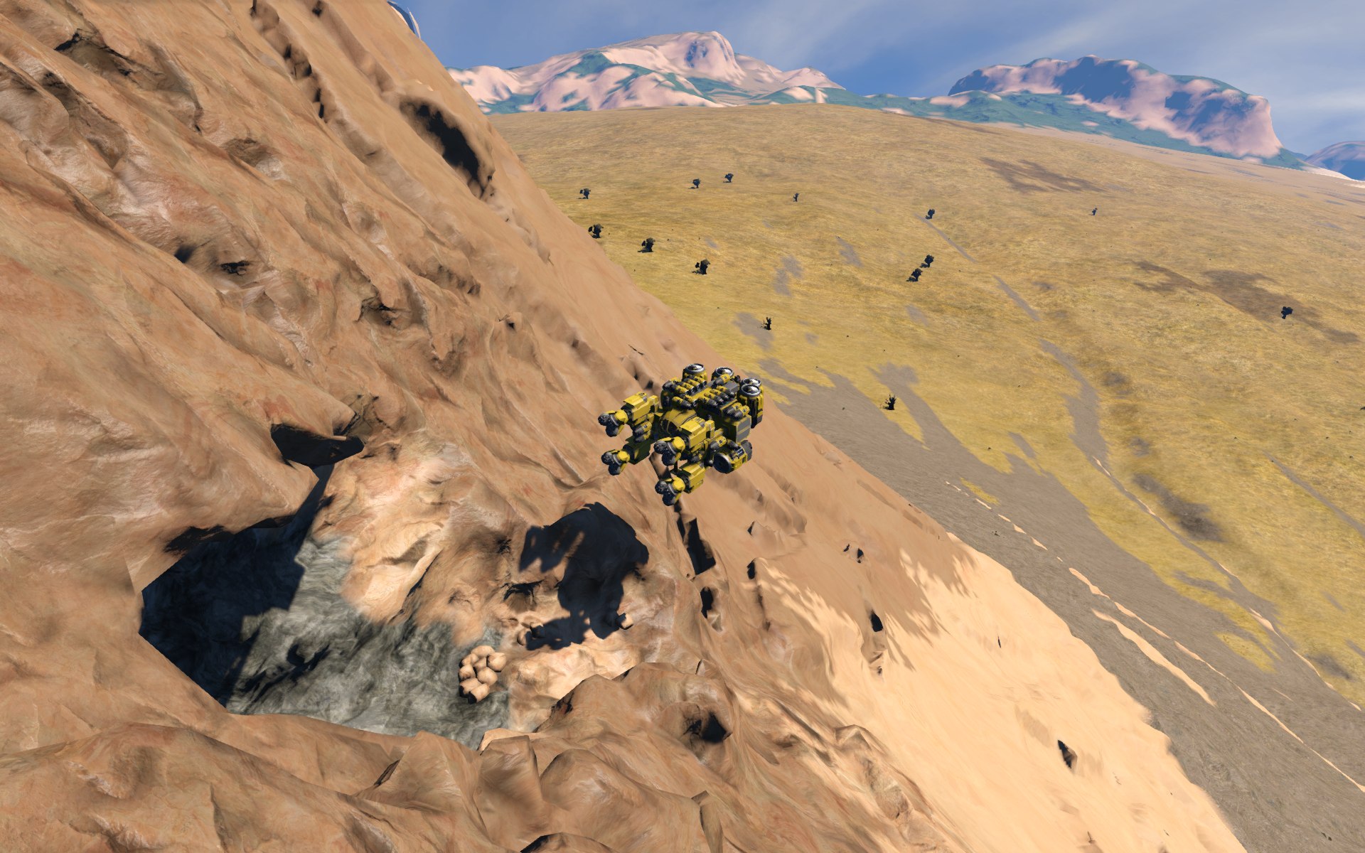 Die hinterlassen ganz schön dicke Krater beim Einschlag. Dieser hier hat etwa 10m Durchmesser und war schon da, bevor ich dort baute.Basis im Berg. Wir sprengten uns hinein, nachdem wir Anfangs Schutz vor den meteoriten benötigten.