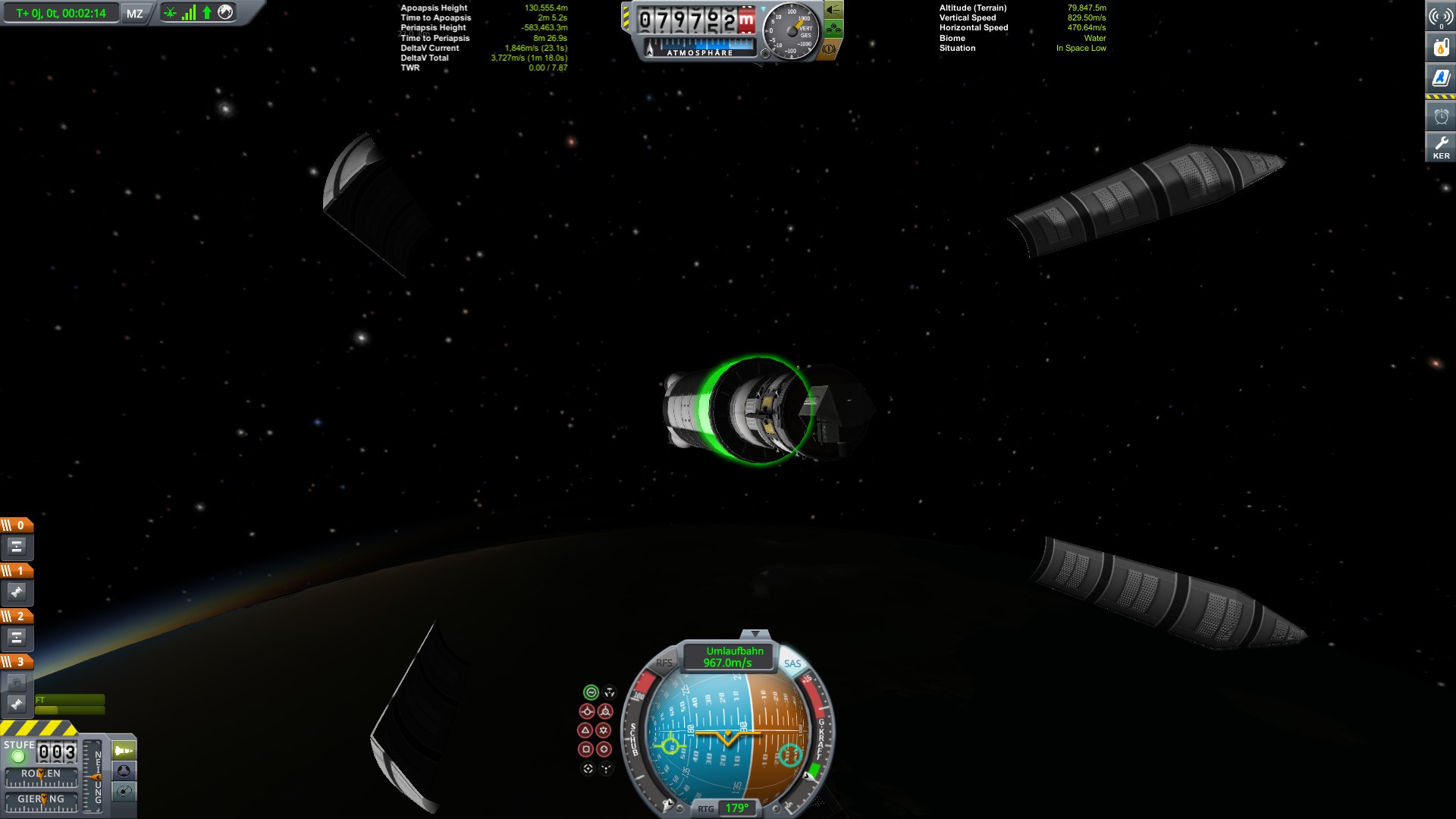 Edith: Ja, die Hauptträgerstufe des Satelliten Novembers war etwas Überdimensioniert gebaut. Hätte auch etwas weniger auch getan, am ende etwas viel Kerbals Dollar raus geworfen (Ich spiele aber Sandbox). TWR mit 2,62 war echt Gemein. Ich wollte eigentlich sogar die Boosters weglassen. Am Ende hatte ich dann einen zu hohen Orbit, den ich wieder angleichen musste. Knappe höhe: 72.000 meter. Ich muss endlich aufhören, die Steuergelder der Kerbals derart aus dem Fenster zu werfen. Zuerst die drei Fehlstarts des Komm Sat, 3 Mal auseinander gebrochen und dann das.