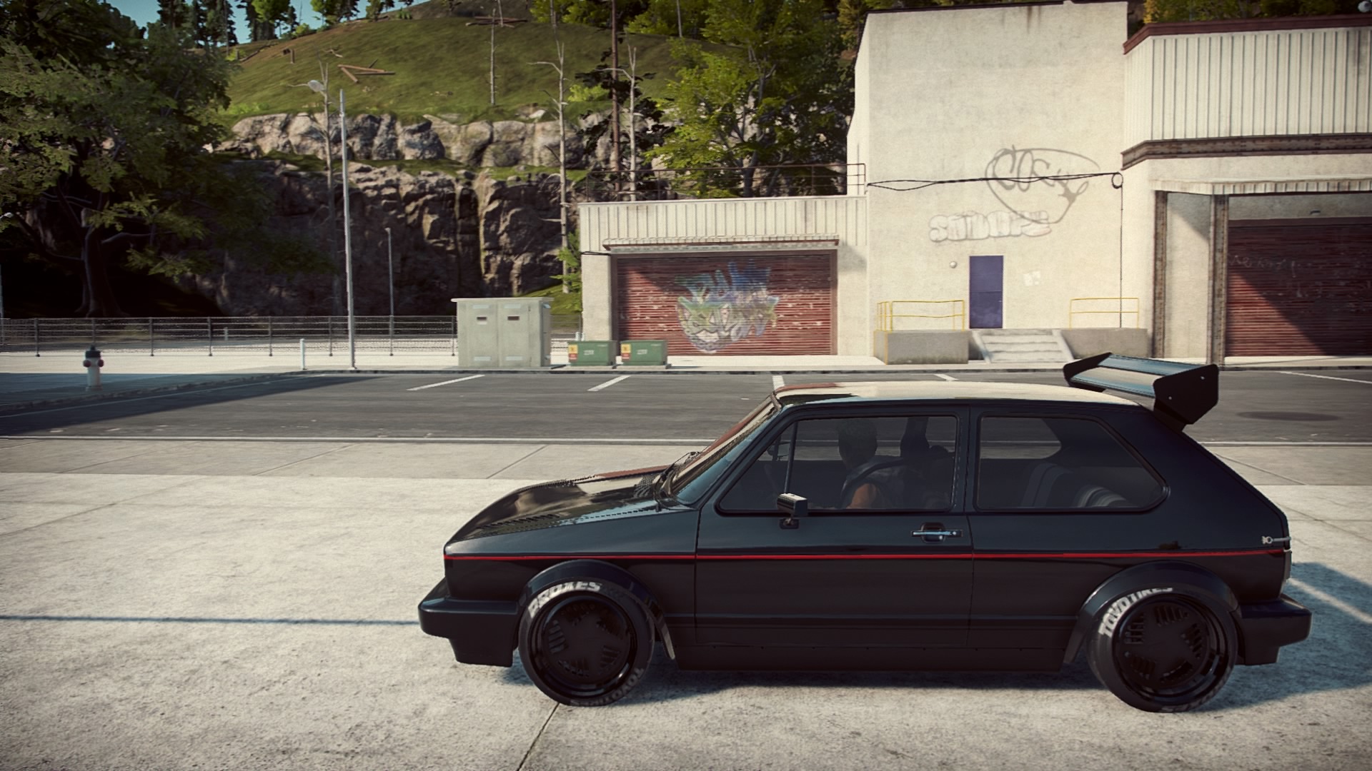 Der Golf GTI von 1976, habe ich so Schwarz mit den roten Zierstreifen gelassen. Und nein, der Motor ist aus und hat Luftfederwerk, der ist nicht ganz so Bodennah. Hab auch den Serienmotor getauscht in einen 2,5l Flat 4 mit 621 Ps.