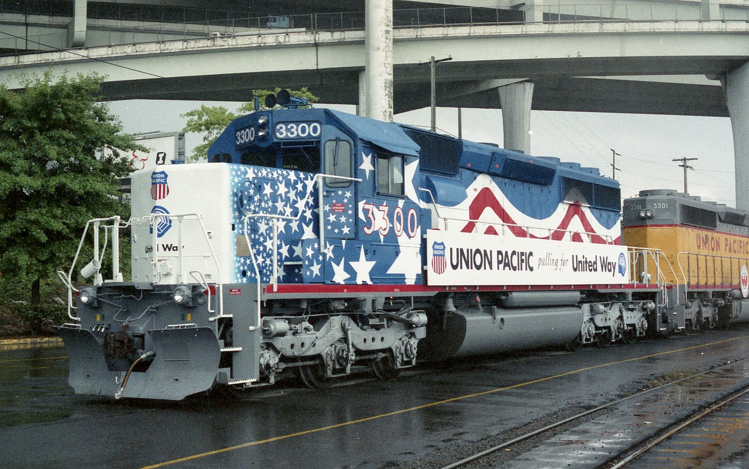 Das Modell dieser Lok ist übrigens ein anderes als das der Standard-SD40-2. Der Hauptunterschied liegt bei der Nase, welche bei der 3300 (und ca. 200 weiteren Union-Pacific-Exemplaren) keilförmig zusammenläuft, bei der alten Lok hingegen 'plattgedrückt' ist. Sozusagen wie Bügelfalte und Kasten-E10. ![]()