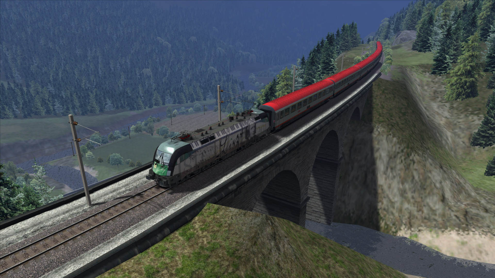 So 2A gefahren,der Höhepunkt quasi. Ich bin absolut begeistert! Ein solch "räumliches" Erlebnis wie am Arlberg hatte ich bisher in RW noch nicht,absolut genial was da geleistet wurde.Selbst Tunnelfahren macht Spass wenn man sieht wie sauber sich die eingleisige Röhre teilt ohne Lücken und Spalten. Hatte einige Screenshots gemacht welche aber irgendwie den räumlichen Effekt in den Bergen nicht wiedergeben können.Auch sehen die Screens etwas milchig aus wobei ich noch mit den Grafikeinstellungen hantiere,die Strecke fordert meinen Rechner mehr als sonst, so verschwanden plötzlich Brücken obwohl alles auf max steht.Also erst alles auf min dann auf max und schon war alles wie es soll nur irgendwie etwas zu hell.könnte vielleicht auch am Wetter liegen werde das die Tage mal ausgiebig testen.