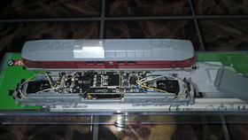 Eine Herausforderung war dann allerdings die Lok zu öffnen, um den Decoder (Lok-Pilot Micro Next18) einzubauen. Im 1:160-Forum belesen, wußte ich nun, was die Schwachstellen des Modells sind. Ein ziemlich fest sitzendes Gehäuse, daß nur mir viel Geduld und einem verbogenen Lichtleiter abzubekommen war und als zweites ein falsch verbauter (zu starker) Widerstand, der durch eine Brücke ersetzt werden muß. Nachdem ich anfangs sehr froh war, diese Hürden gemeistert zu haben, war ich dann recht ernüchtert als ich feststellte, daß ich beim Gehäuse abheben die zwei Lichtabdeckungen vorne dem Teppichgeist geopfert habe (alles was auf der dicken Wohnzimmerauslegeware verloren geht, bleibt auch verloren
