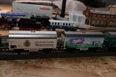 Auch habe ich och ein paar weitere gedeckte Güterwagen mit Werbeaufdrucken. Die auf den Bilder zu sehenden sind alle voll fahrbereit, ein paar weitere (2 x Haribo) sind beschädigt oder fehlen Kupplungen. Einzig den "Vivil" würde ich behalten, der Rest darf weg. Gerne bin ich auch da für ein Tauchgeschäft zu haben, ich suche vor allem epochentypische Selbstentladewagen oder gedeckte.