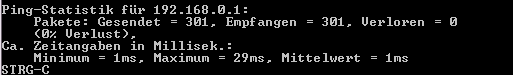 Das Resultat davon ist, daß Internet über W-LAN funktioniert. Habe auch mal den Router ein paar Minuten lang angepingt --> siehe Anhang. Gestern gab es da noch starke Abweichungen bis zu 1333 Millisekunden und sehr oft eine Zeitüberschreitung.