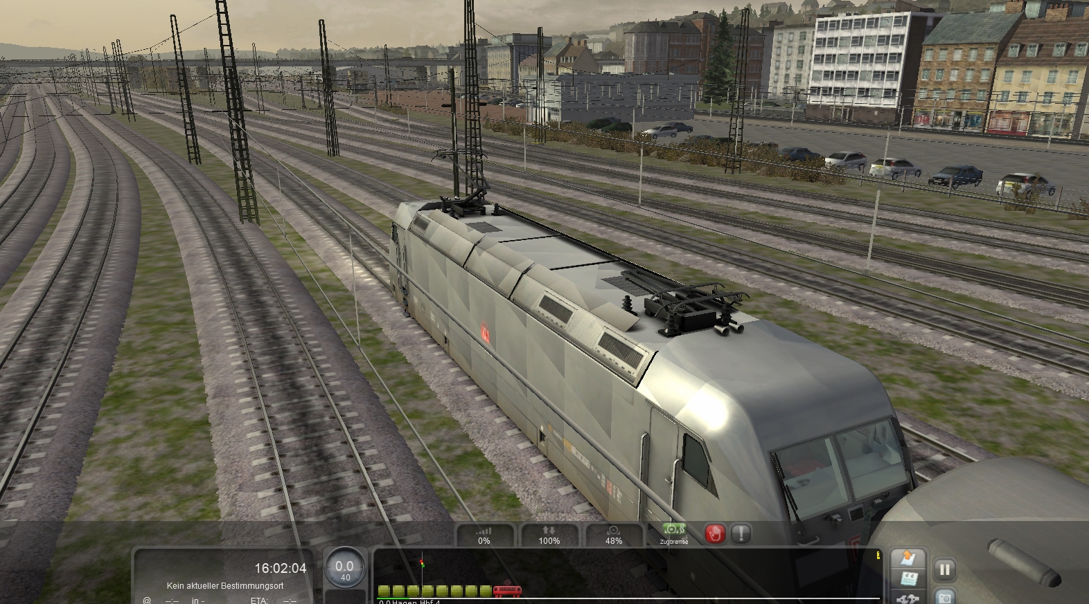 Ich habe darauf die Grafikeinstellung auf Hoch gestellt. Dabei habe ich die Streifen nicht mehr gesehen, aber kleine Quadrate, die sich in der Helligkeit unterscheiden, auf dem Zug [Grafikfehler Hoch]. Anschließend habe ich wieder die Grafik auf Gering eingestellt und dieses mal waren die Streifen unauffälliger.