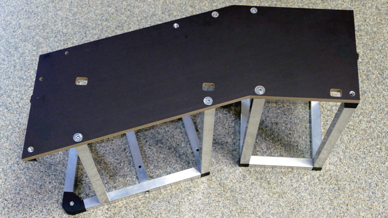 Das ALU-Puzzle ist eingetroffen. Die Schrauben, welche zur Befestigung der Holzplatten benötigt werden, habe ich ebenfalls gekauft. So schaut es nun aus. Nun muss die Skizze für die CNC-Fräse erstellt werden, damit der Boden aus der Siebdruckplatte (braun) gefräst werden kann. Aus der Sperrholzplatte entstehen die Front- und die Rückseite.