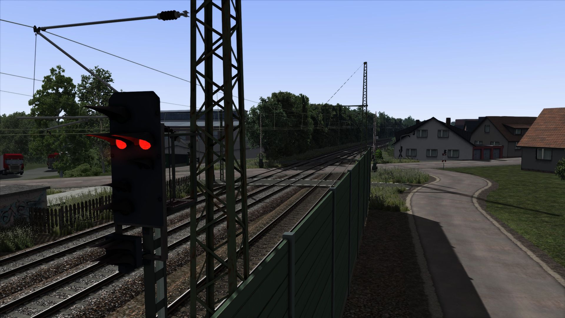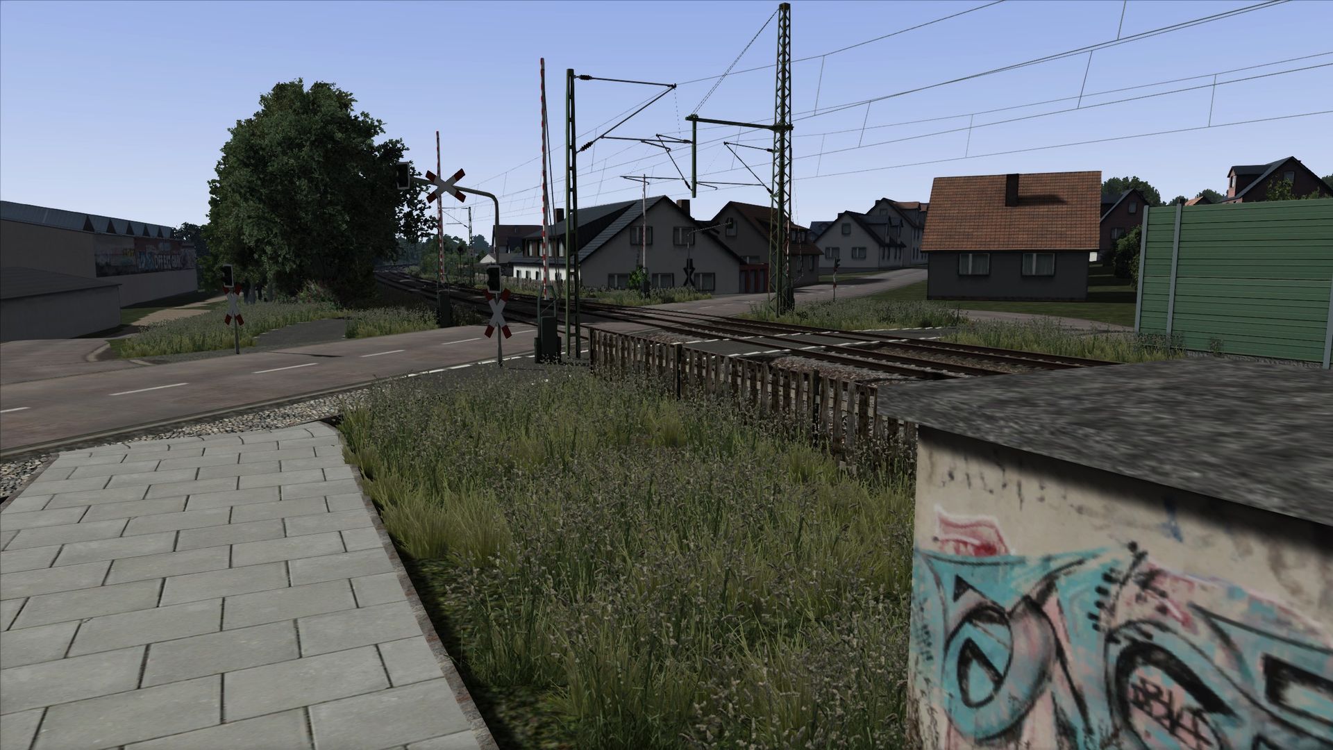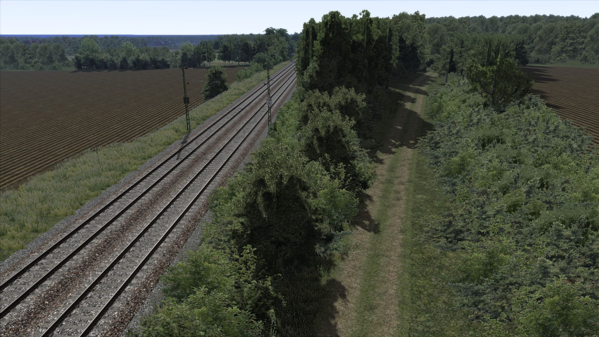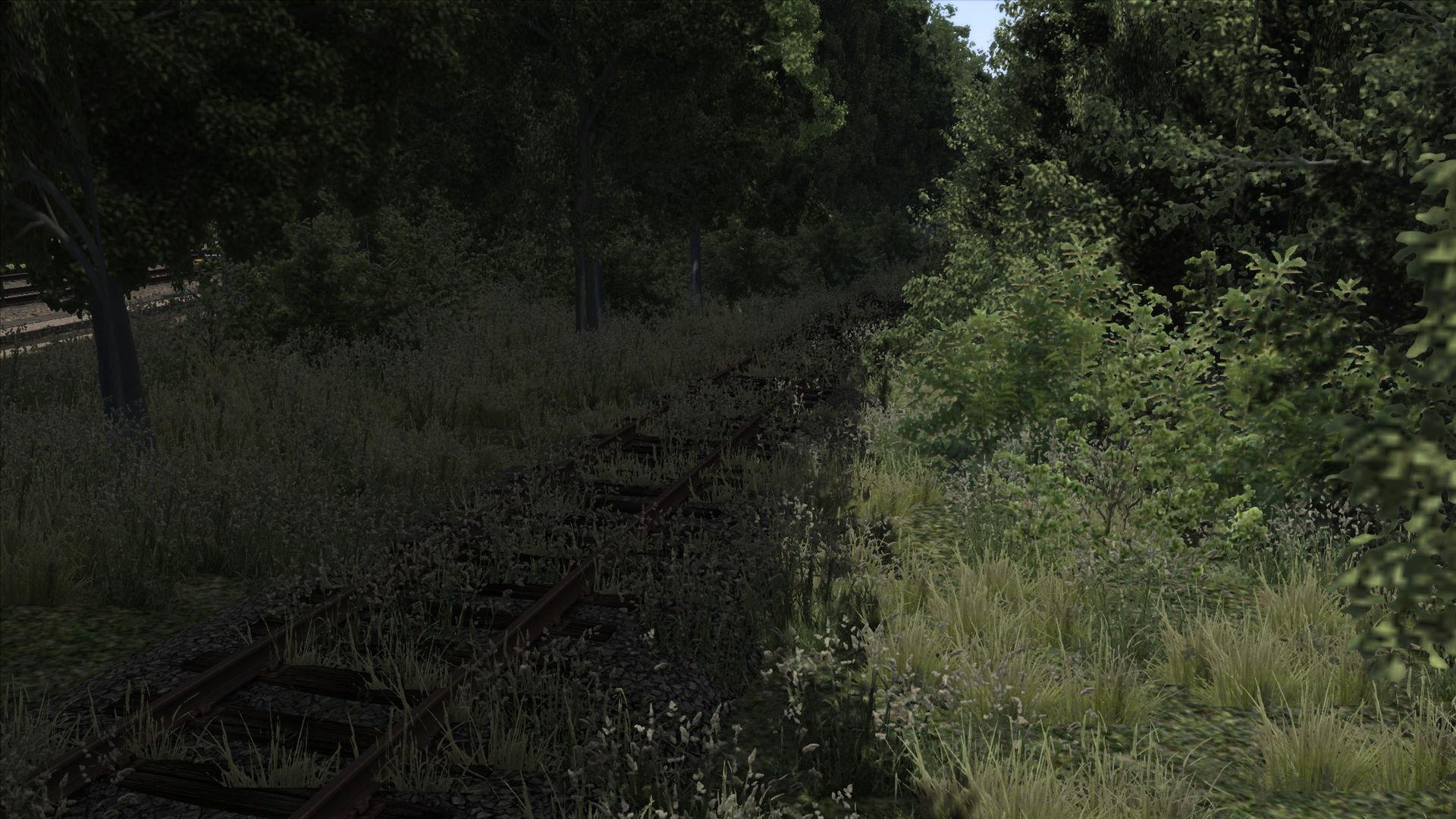 Ich habe Vegetation hinzugefügt, Zäune, ein paar Häuser an der ein oder anderen Stelle, sowie ein paar alte Gleise am Rand der Strecke ergänzt.