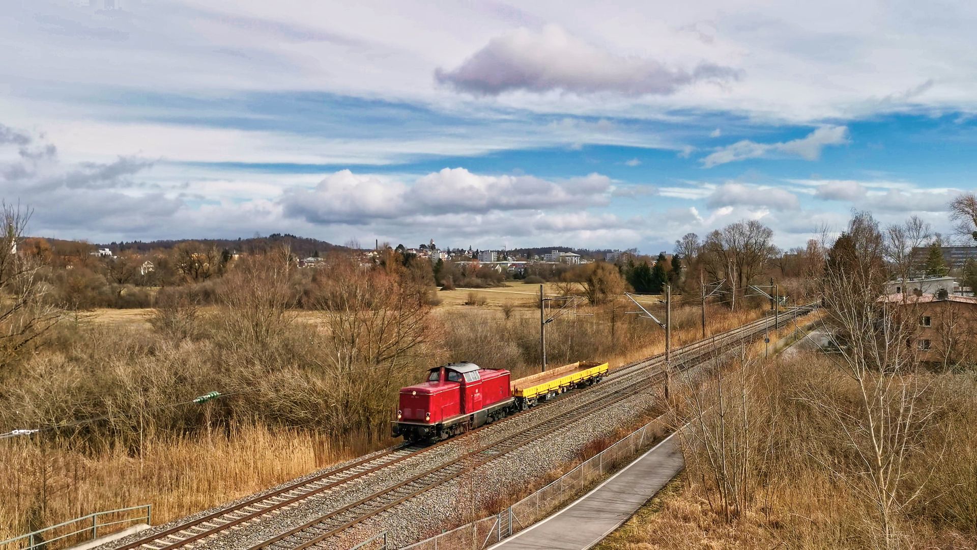Am Dienstag, 22.2.2022 holte 212 133-3 diesen gelben Flachwagen (Res) aus Konstanz ab, der dort nach Abschluss der Bahnsteigbaustelle nicht mehr benötigt wurde. Die Aufnahme des "modellbahngerechten" Güterzuges ist zwischen Konstanz-Wollmatingen und Reichenau(Baden) entstanden. Im Hintergrund kann man den Konstanzer Stadtteil Wollmatingen gut erkennen.