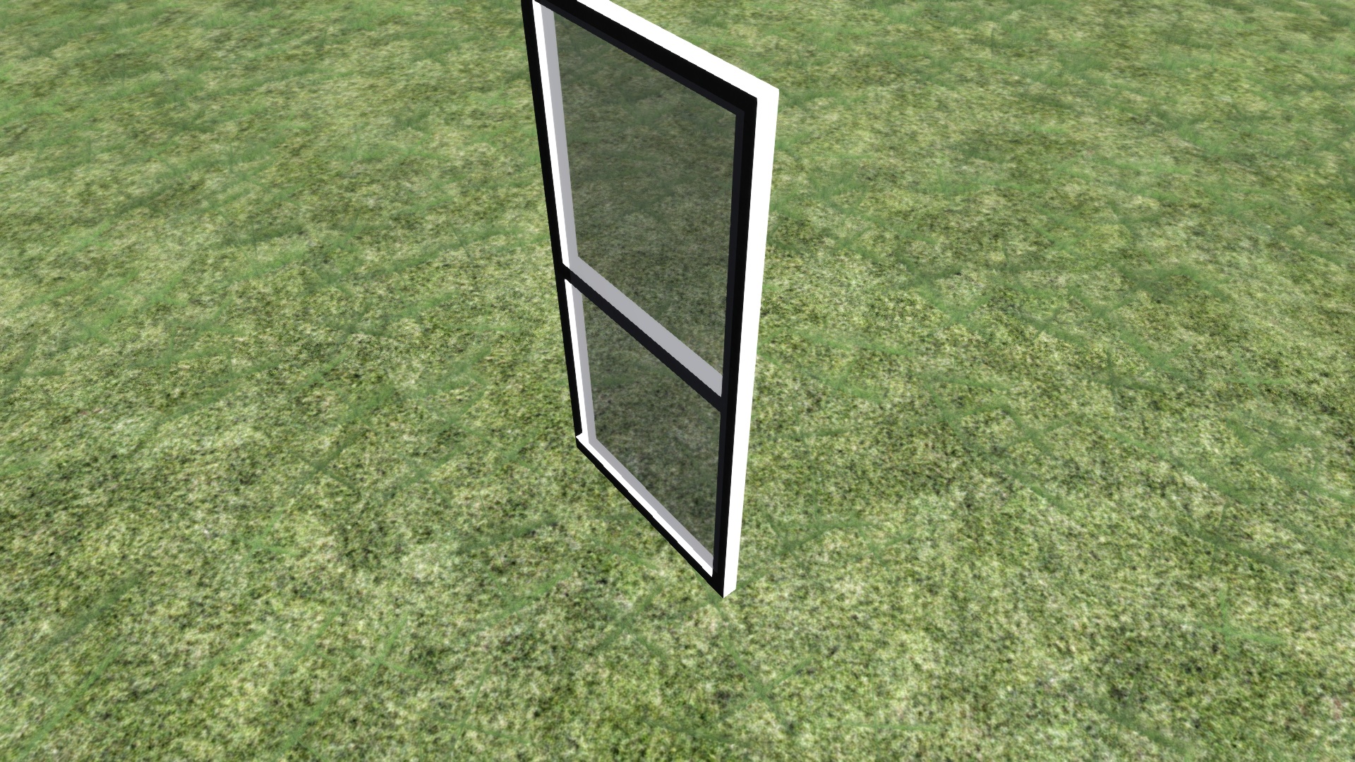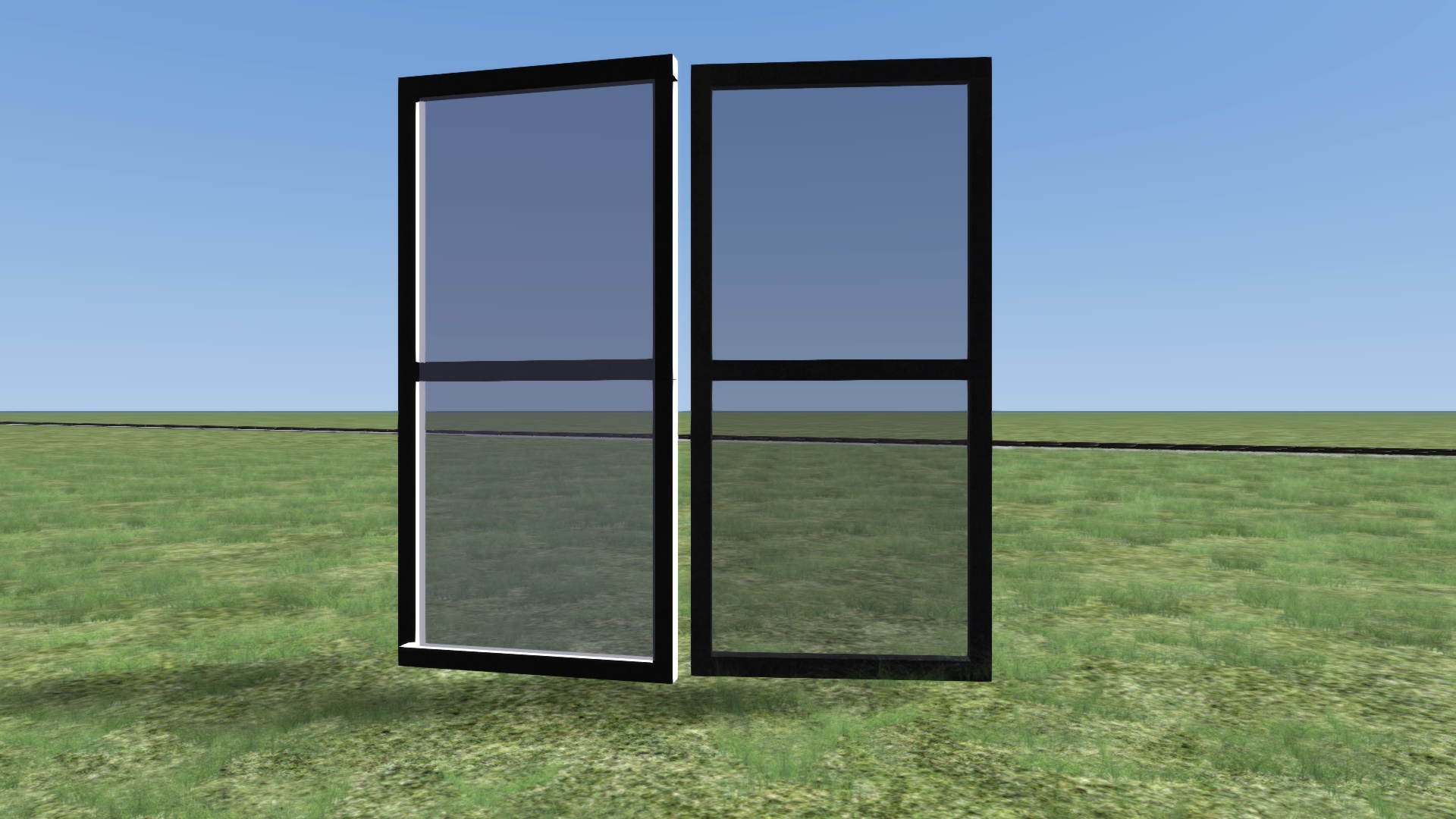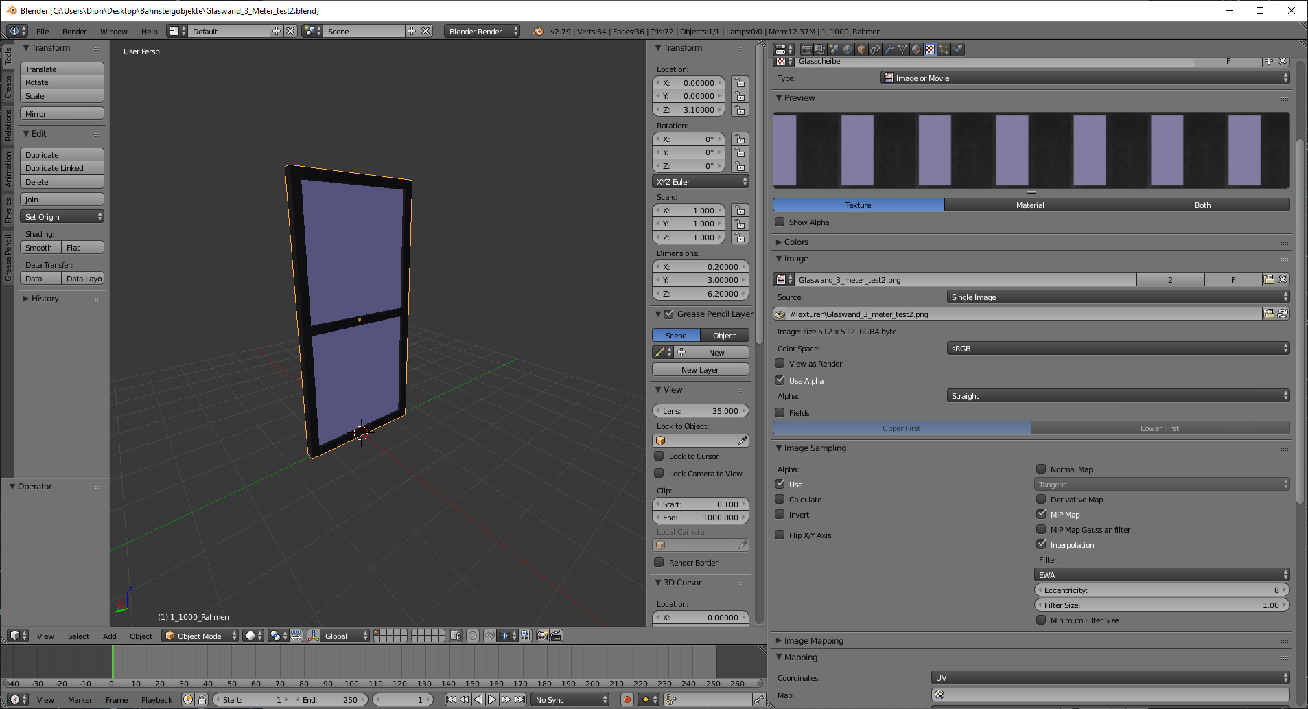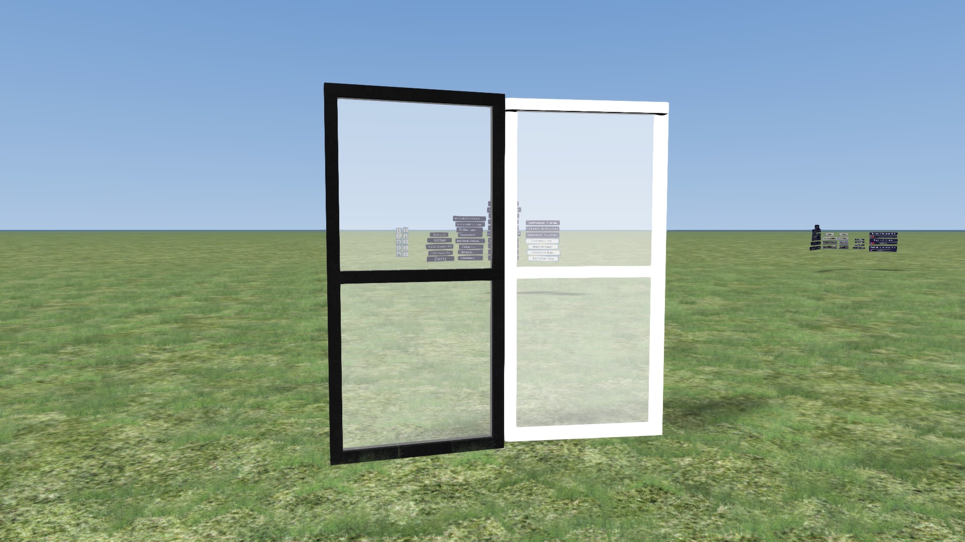Das Ziel ist eine 3 Meter breite und ca. 6 Meter hohe Glasscheibe mit einem schwarzen Rahmen (siehe Bild unten), jedoch erscheint sie nach dem Export in Richtung Licht in weiß und auf der anderen Seite in schwarz (siehe noch weiter unten), ich vermute deshalb mal, dass es am Shader oder der UV-Map/Textur liegt.