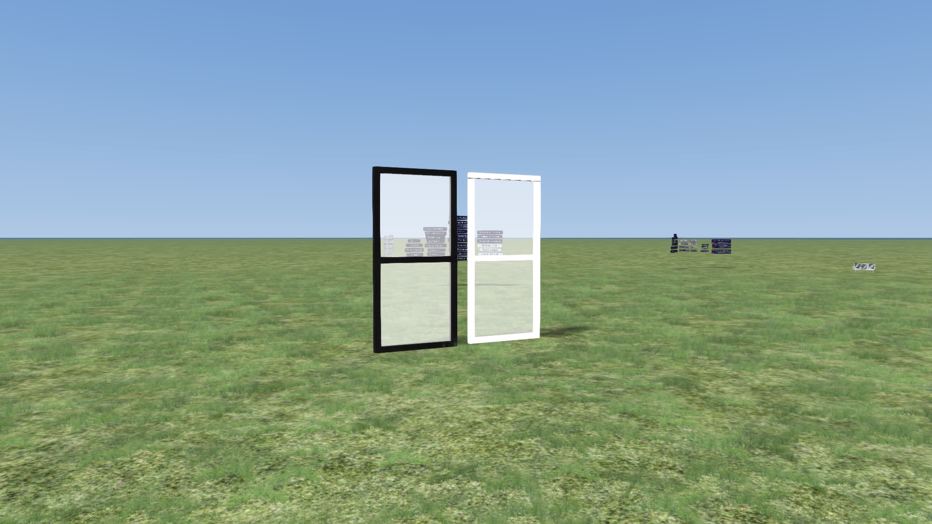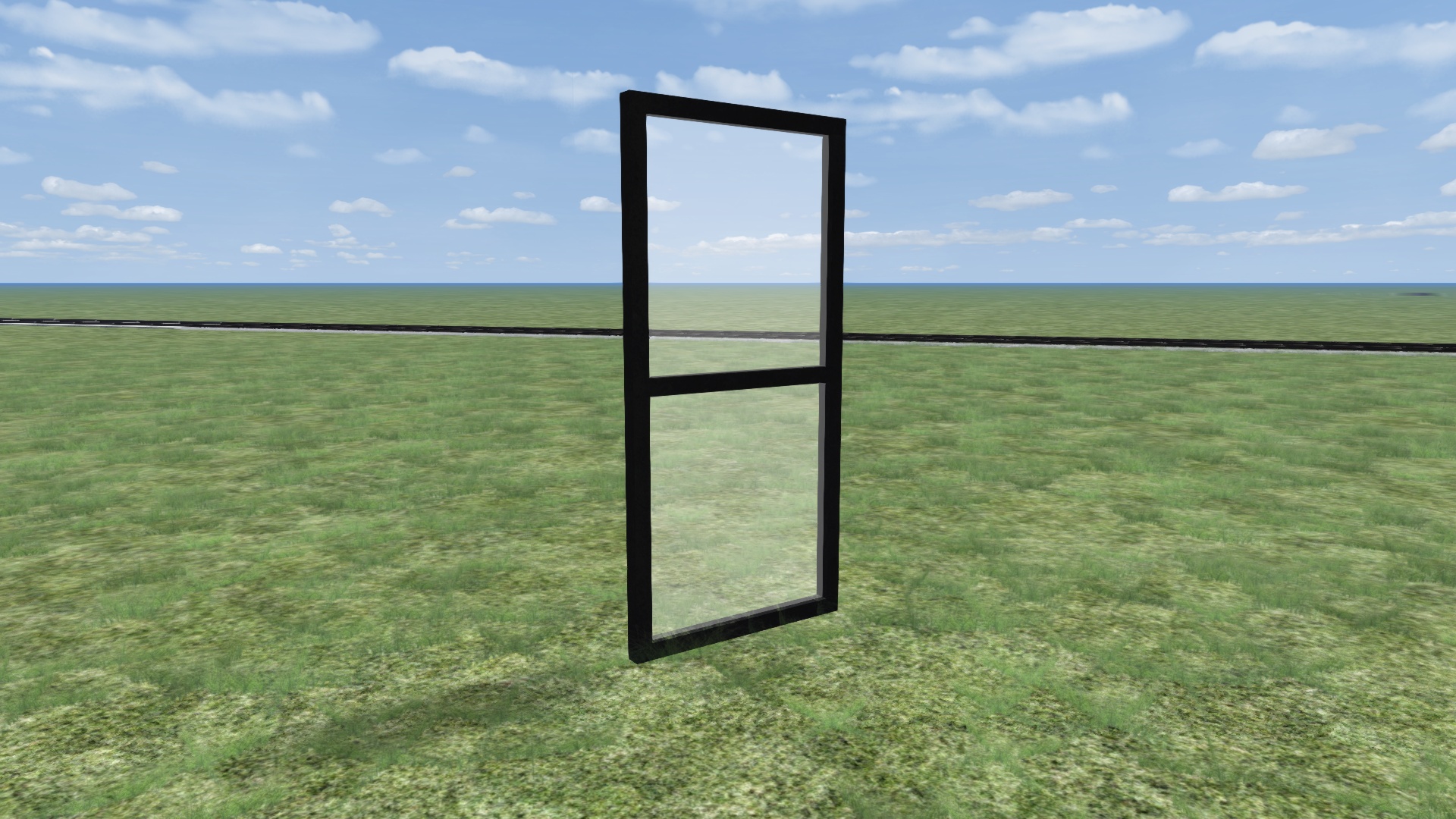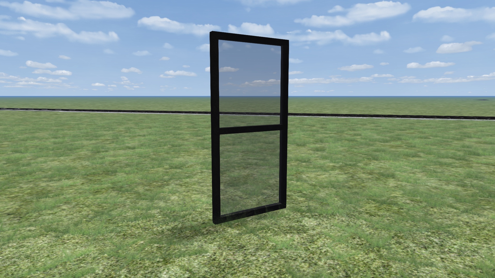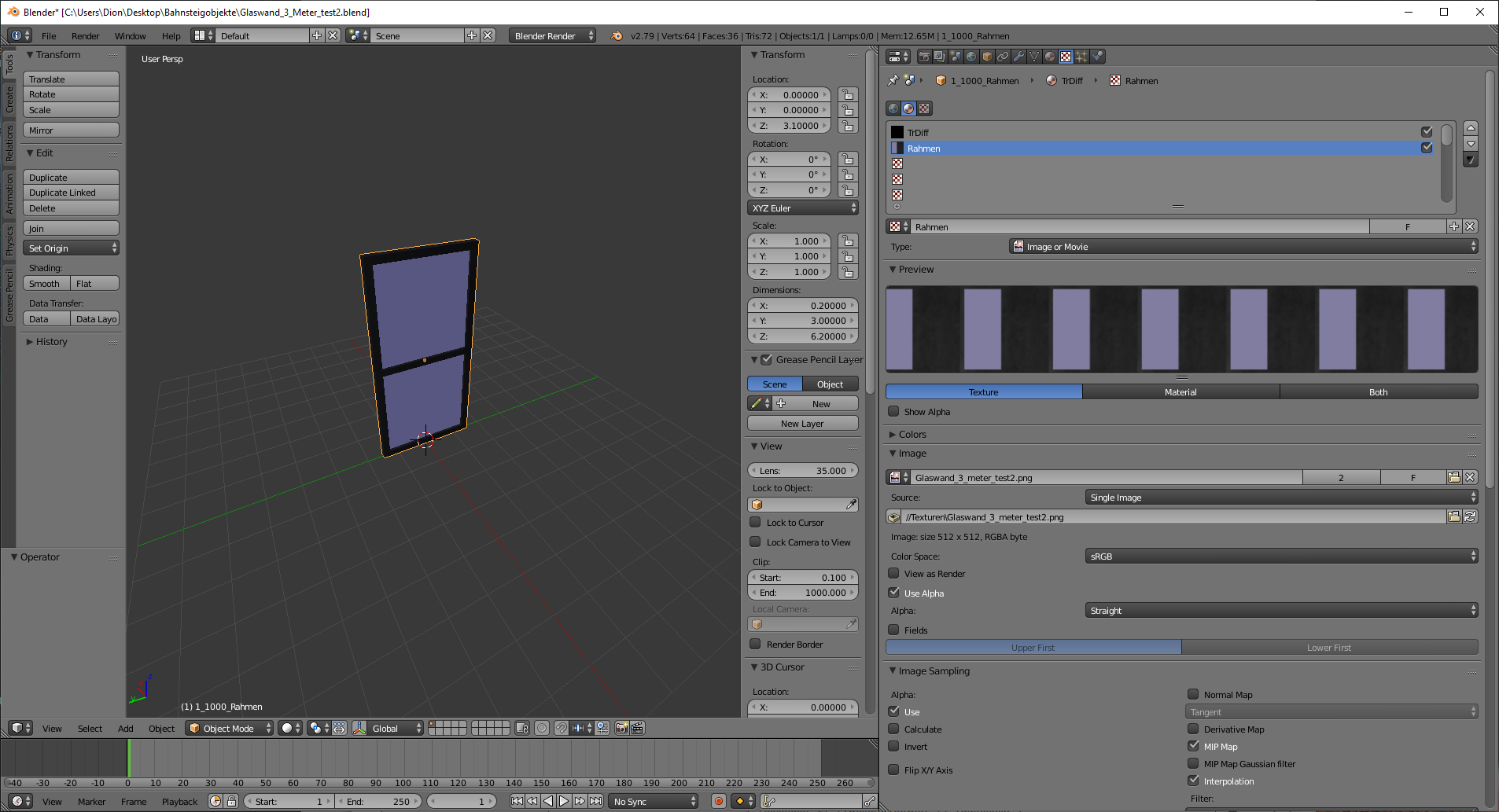 Das Ziel ist eine 3 Meter breite und ca. 6 Meter hohe Glasscheibe mit einem schwarzen Rahmen (siehe Bild unten), jedoch erscheint sie nach dem Export in Richtung Licht in weiß und auf der anderen Seite in schwarz (siehe noch weiter unten), ich vermute deshalb mal, dass es am Shader oder der UV-Map/Textur liegt.