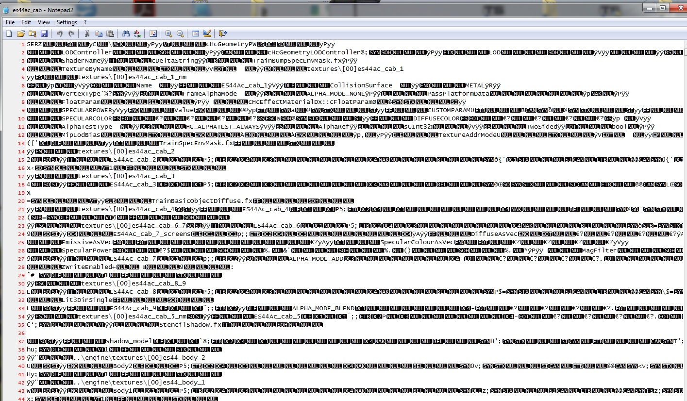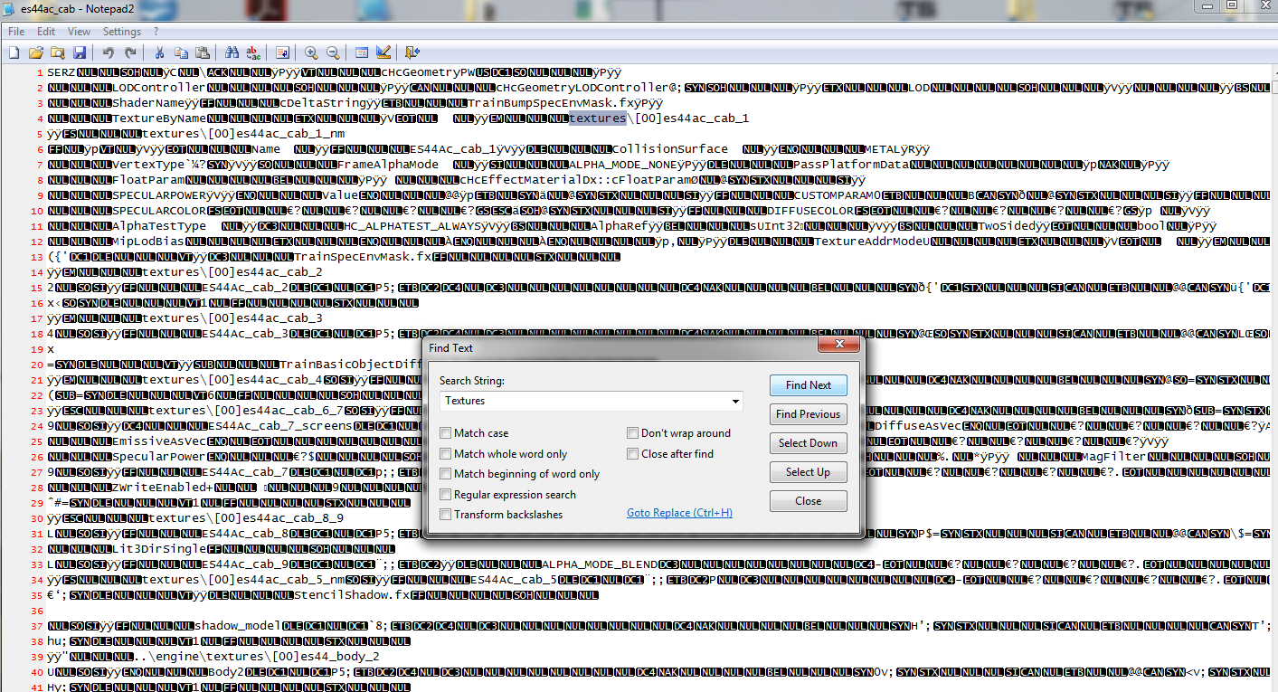 Dazu Geopcdx einfach mit Notepad2 öffnen-die Meldung mit ja bestätigen und im nächsten Bild über das Fernglasymbol -mit Eingabe "Textures"find next alle Texturen nacheinander anzeigen lassen.Das Blaue Feld springt bei jedem Klick zur nächsten Textur die in dieser Geo festgelegt ist .