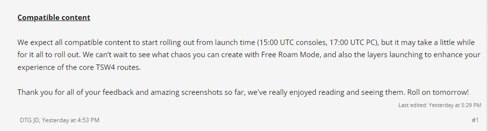 - die Fahrphysik der Lokbespannten Reisezüge (146 + Dosto) hat sich - aus meiner Sicht - sehr stark verbessert und kommt jetzt der Realität definitiv näher als noch zum Anfang. Früher haben die Züge im TSW alle etwas unrealistisch schnell und stark gebremst.