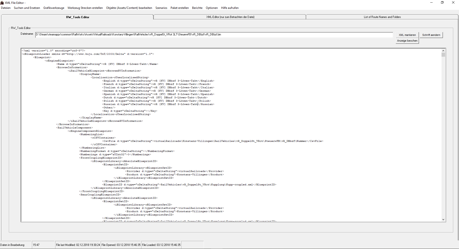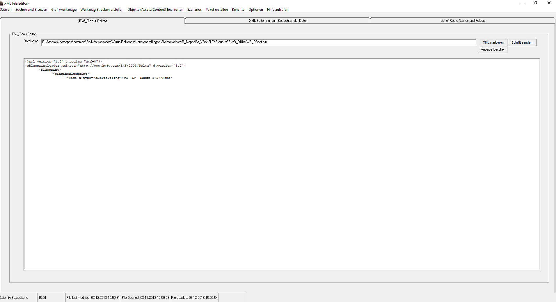 Ich hab folgendes Problem, und zwar mache ich grade für (erstmal) Private zweck ein paar repaints und nach dem ich die .bin Dateien von den Konstanz-Villingen Dostos bearbeit habe, diese gespeichert habe und diese auch wieder öffne steht dort statt dem Ürsprünglichem text nicht (siehe Bilder)Bearbeiten tue ich das ganz mit RWtools, habe es aber auch schon mit der serz probiert, iwie geht nicht.