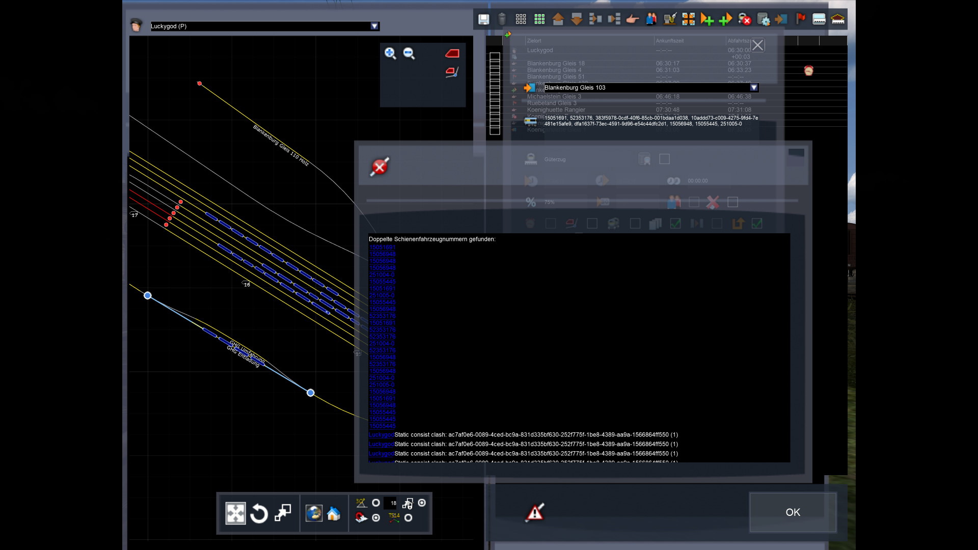 Der erst davon ist das Abkuppeln der Schublok. Das funktioniert zumindest bei mir wieder nicht. Vermutlich wegen der mehrfach vorkommenden Fahrzeugnummer "251004-0". Das solltest du dir nochmal ansehen.Viele Grüße