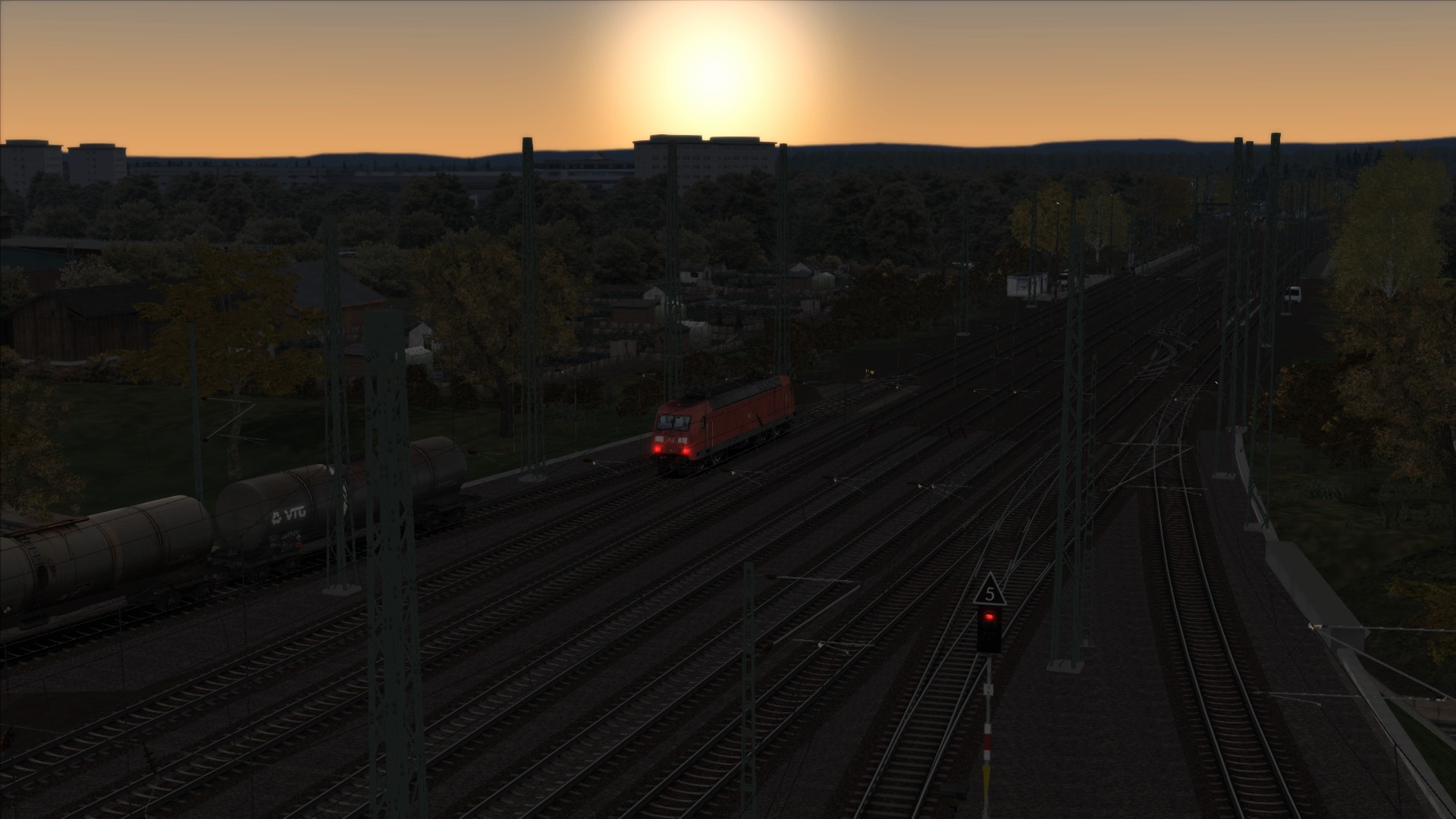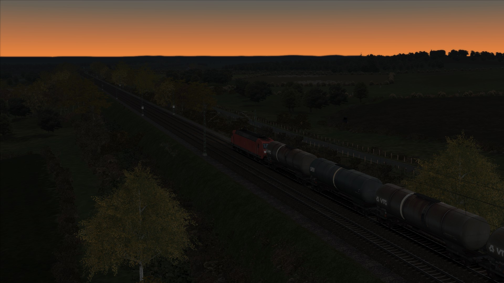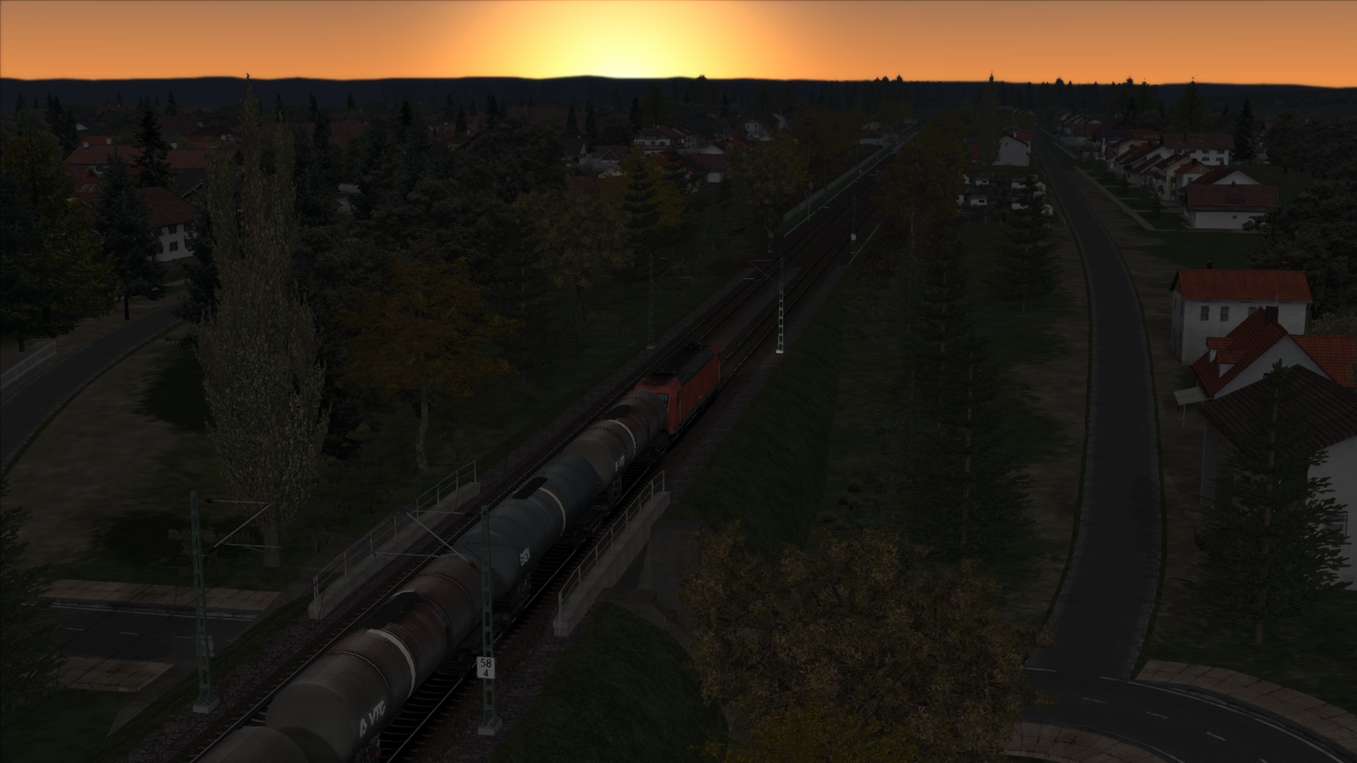 Tankzug in Bayern und die Sonne geht auf.