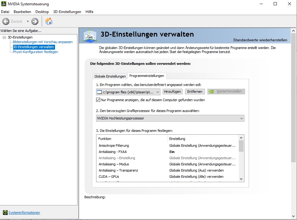 So wird der TS2019 in der NVIDIA-Systemsteuerung mit der 3D-Grafikkarte betrieben