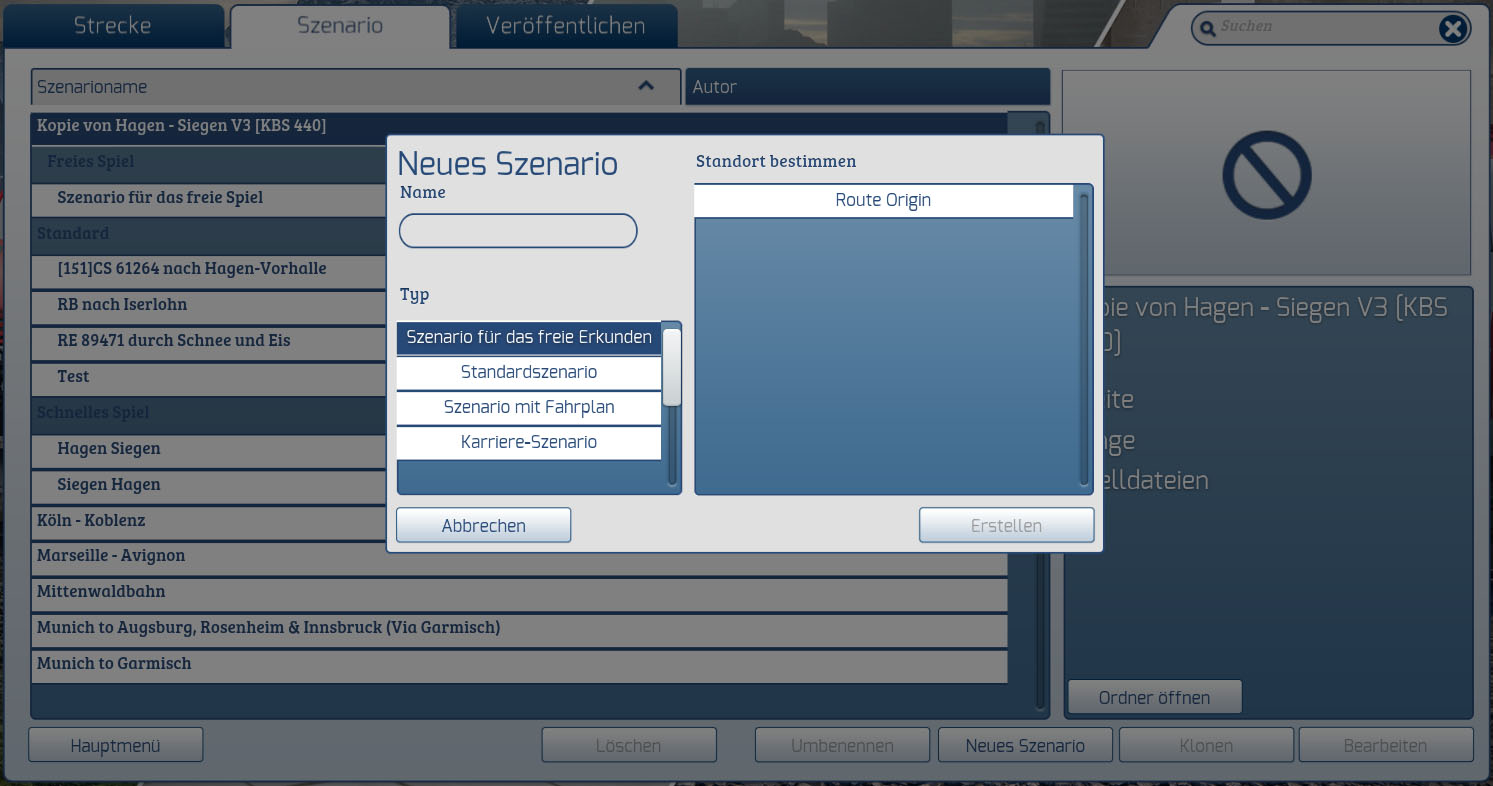 Nachdem ich bei der Kopie/Klon o.g. Zeilen sowie im Original geändert hatte, wurden bei der Kopie von Hagen - Siegen V3 nun auch die Standorte angezeigt. Aber leider bricht das Erstellen eines neuen Szenarios immer mit einen Dump-Fehler ab. Zwar ist nach einem Neustart von TS der Name des neuen Szenarios vorhanden, aber weder editierbar und/oder spielbar.