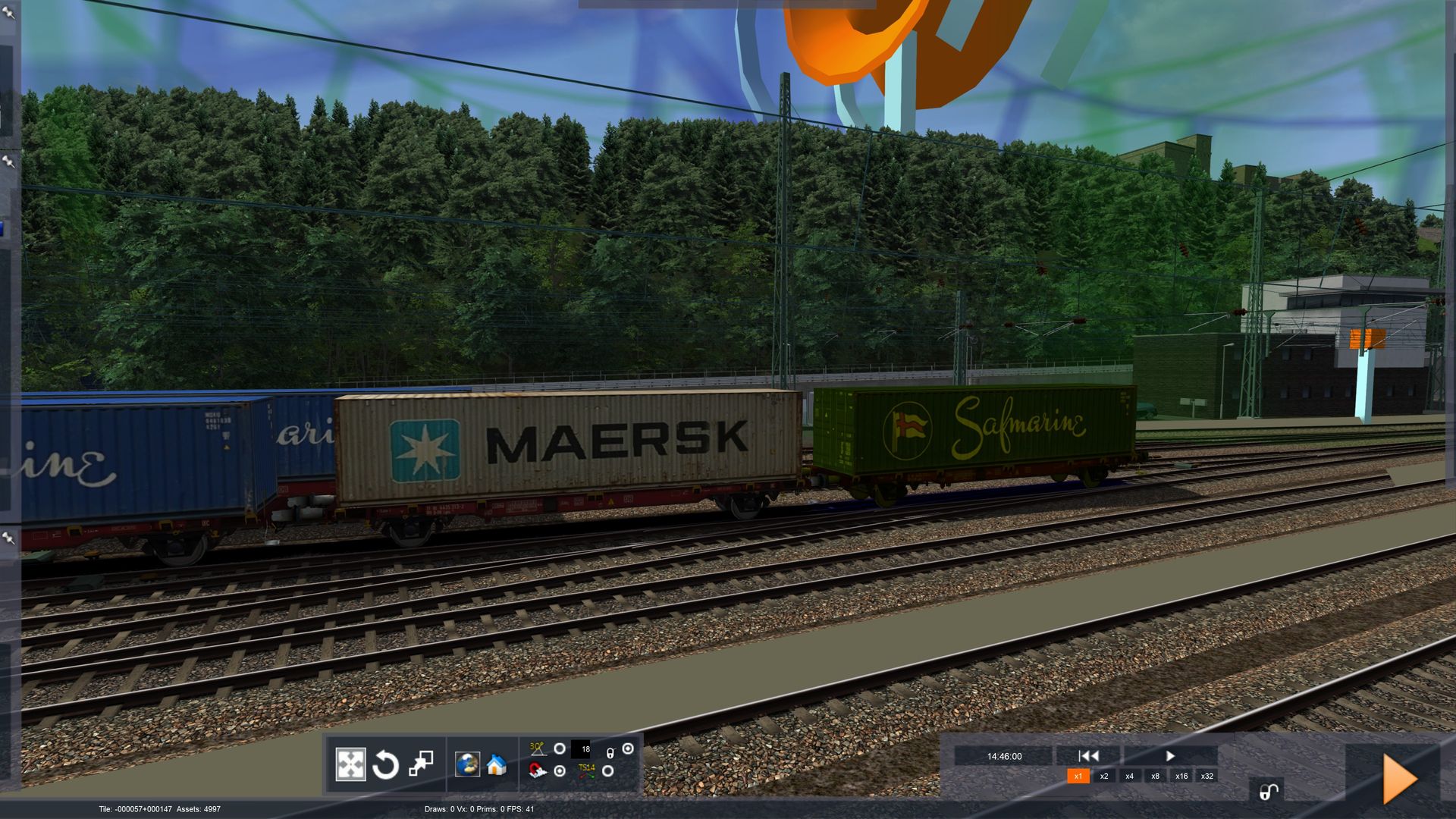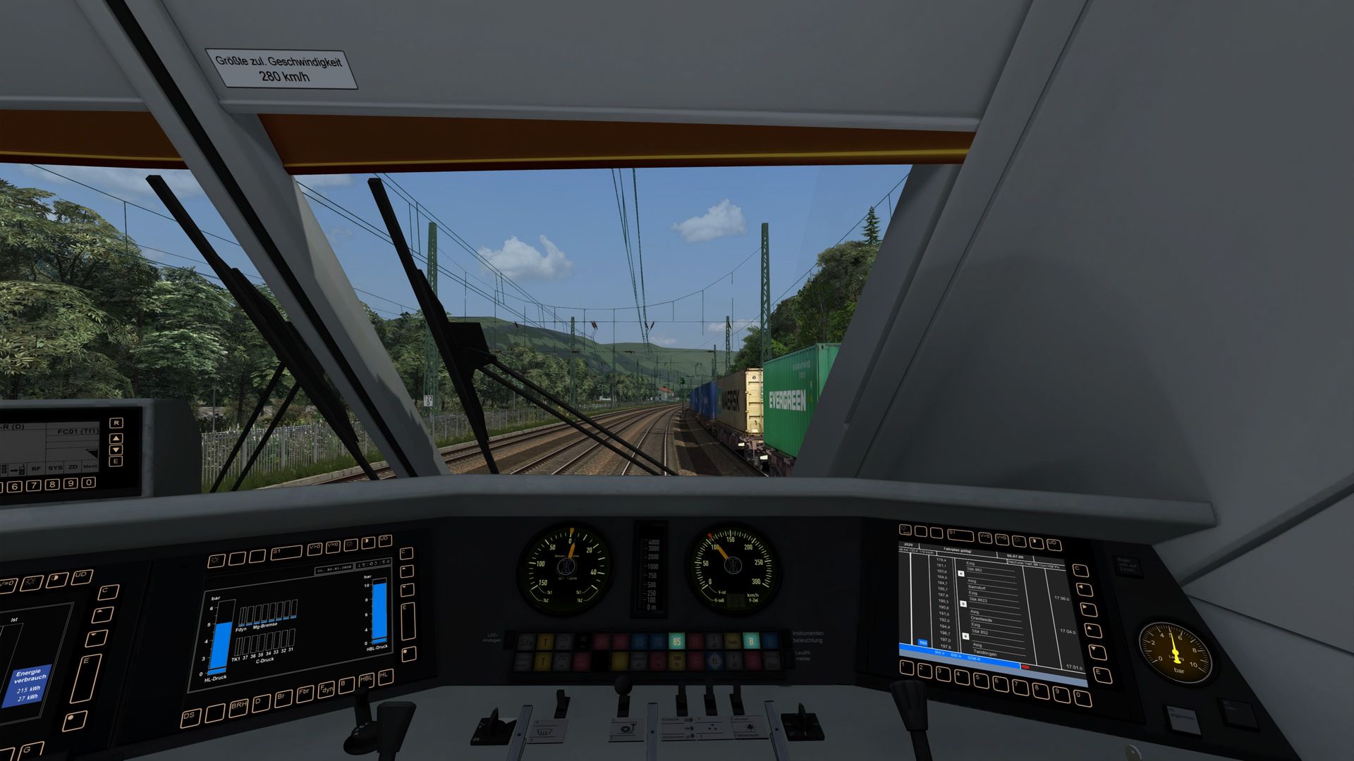 ICE 925 by Malte J. Driving the ICE2 here from the Steuerwagen; it is nice and quiet, and the sounds are good. Pic is from cab, using Ebula, and to the right, you can see MAERSK containers with a "K" - how they (almost) should be (my own texture mod).