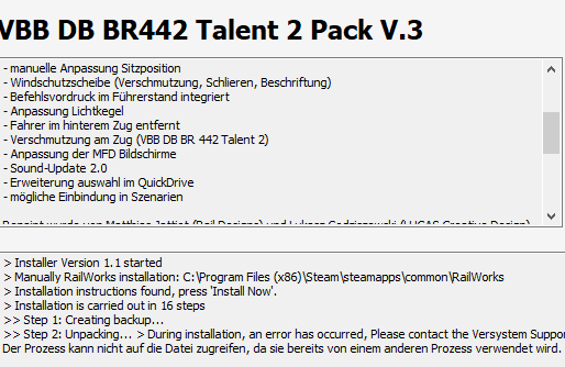 Guten Tag, wenn jenes Repaint installieren will, taucht bei mir die unten zusehende Fehlermeldung auf. Ich habe den Talent2 schon 3 Mal neuinstalliert, immernoch. MfG, Fabian