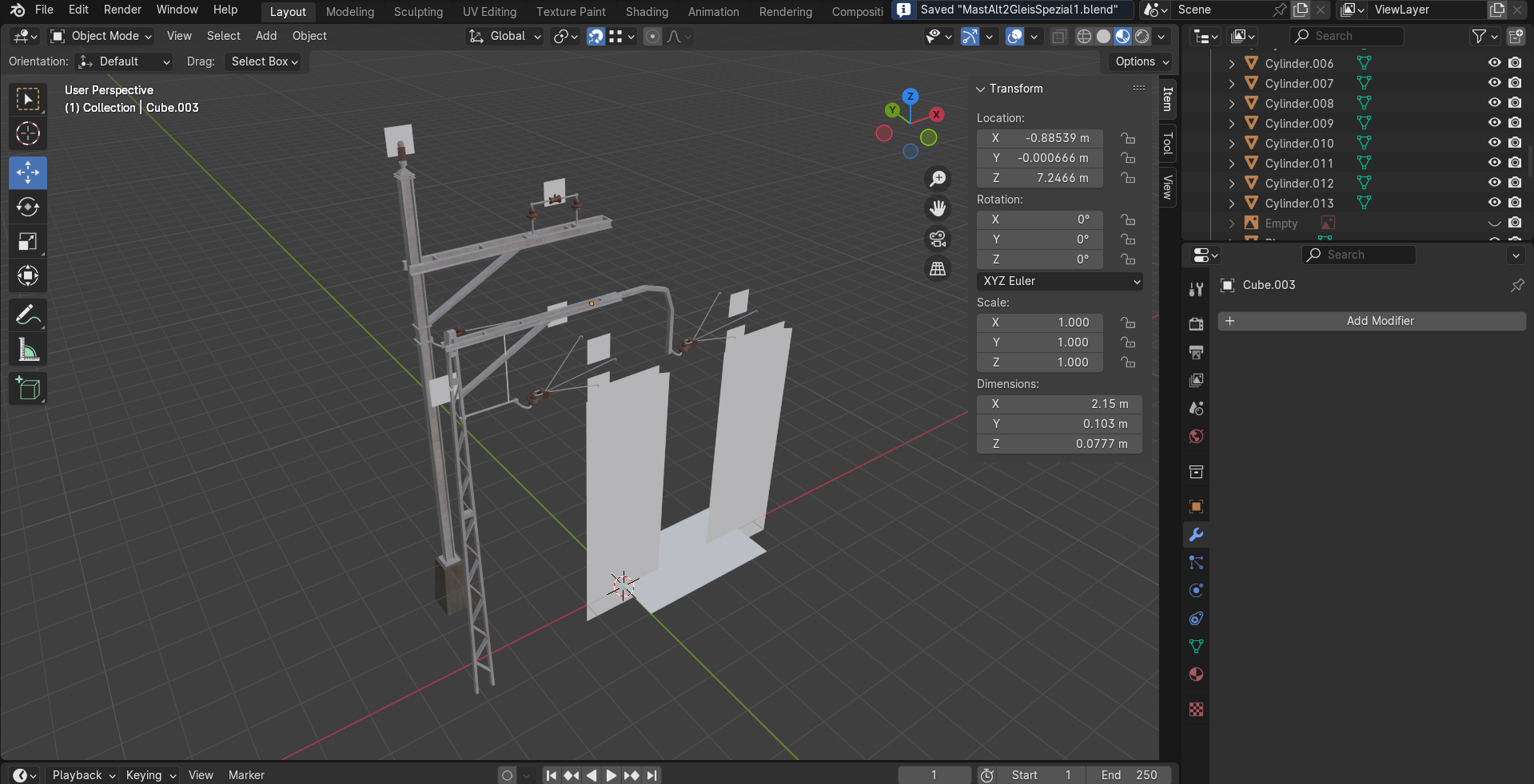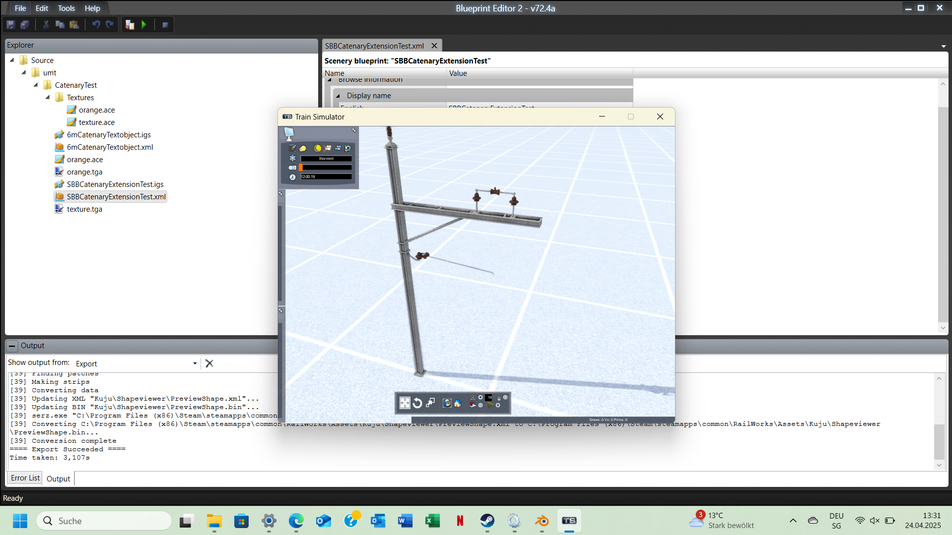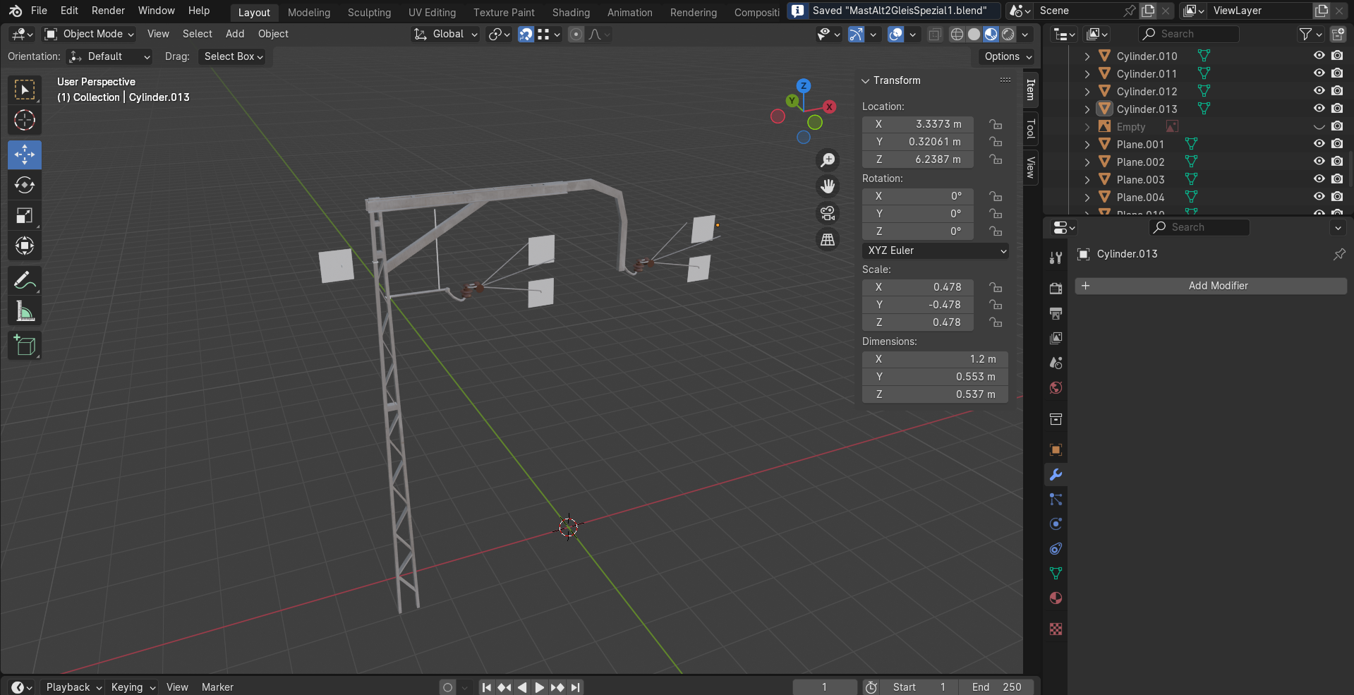 Ich habe die Planen als invisible exportiert.Externer Inhalt youtu.beInhalte von externen Seiten werden ohne Ihre Zustimmung nicht automatisch geladen und angezeigt.Durch die Aktivierung der externen Inhalte erklären Sie sich damit einverstanden, dass personenbezogene Daten an Drittplattformen übermittelt werden. Mehr Informationen dazu haben wir in unserer Datenschutzerklärung zur Verfügung gestellt.Den neuen Masten für 2 Gleise habe ich etwas zu klein gebaut. Ich benütze den ersten Masten als Referenz, damit die Qualität gleich bleibt.