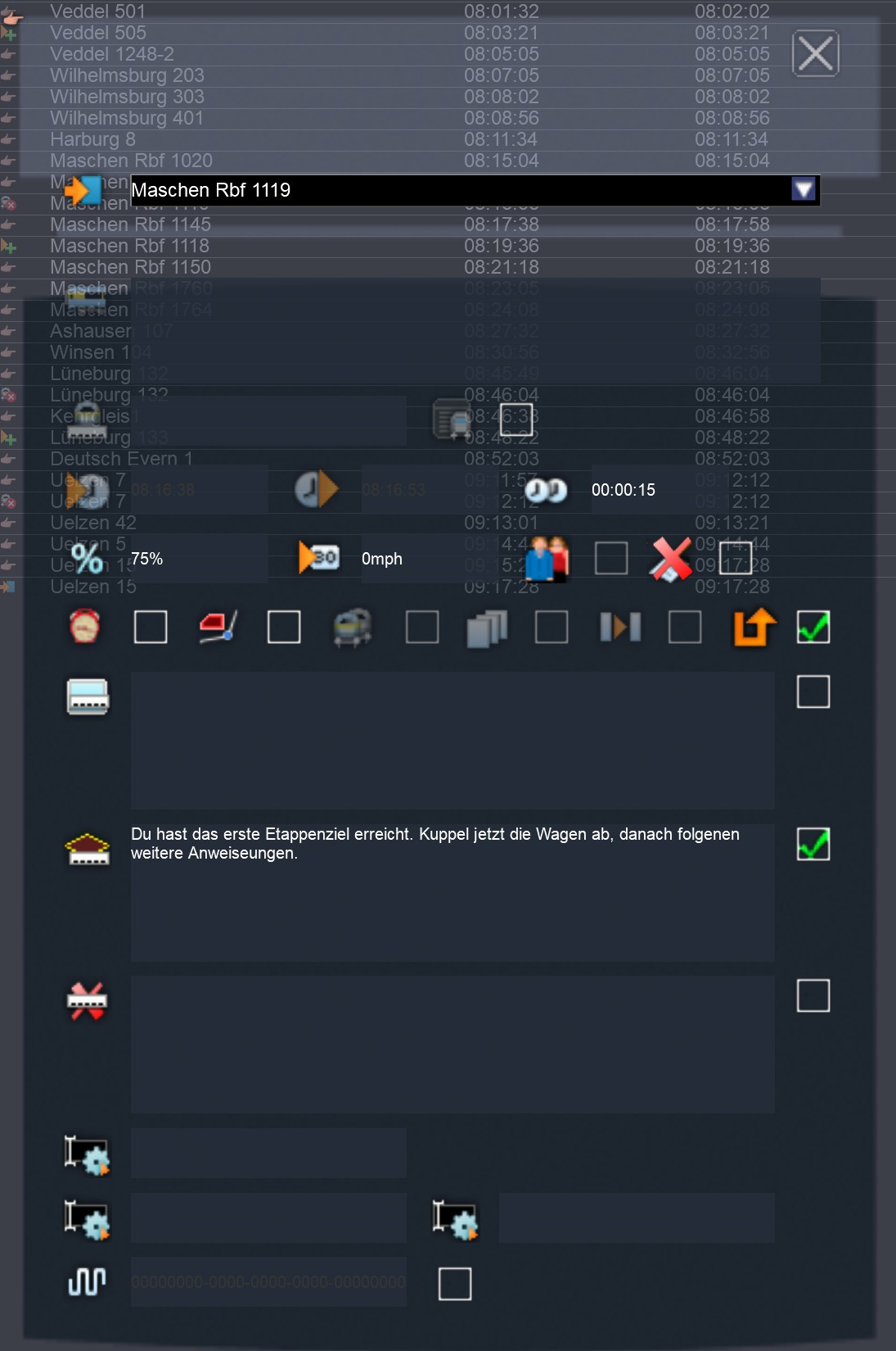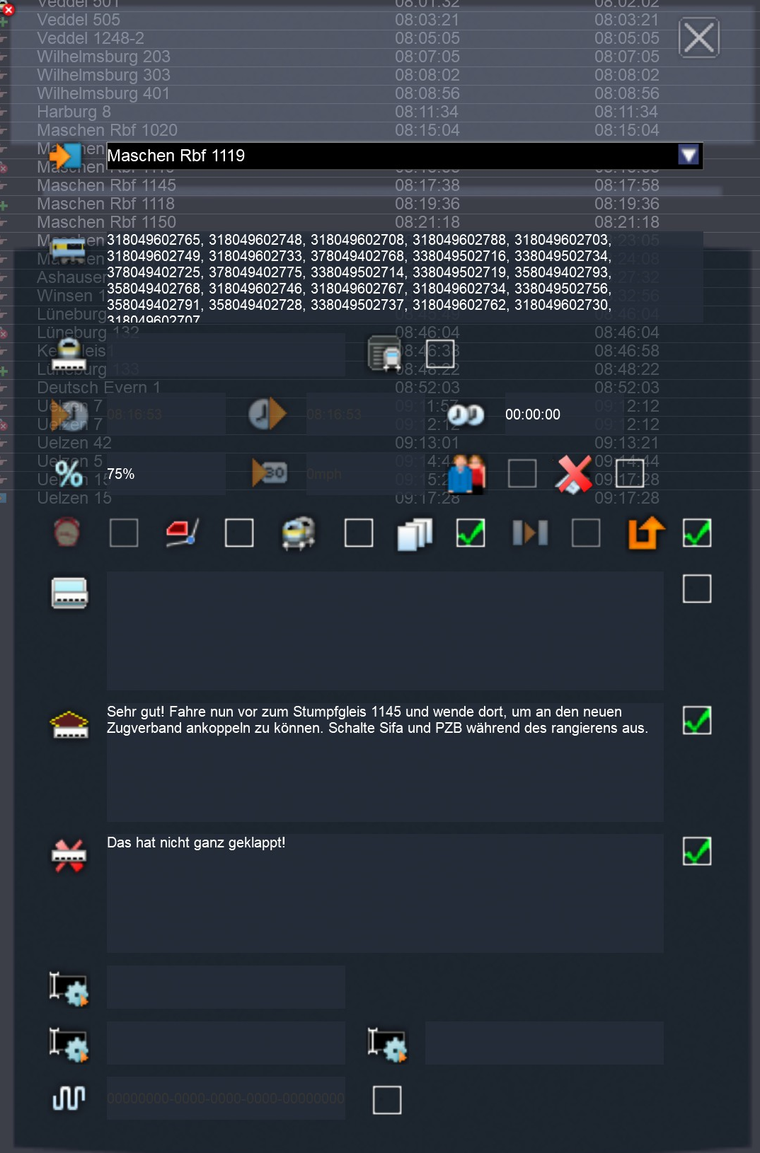 Ich habe folgendes Problem bei der Szenarienerstellung. Ich möchte mit meiner vR BR 151 EL mehrere Güterzüge auf der Strecke Hamburg - Hannover bewegen. Einmal einen Zug von Veddel nach Maschen, dort einen anderen Zug weiter von Maschen nach Lüneburg und dort einen dritten Zug bis nach Uelzen. Während das Ankuppeln und ziehen der Wagen zum jeweils nächsten Etappenziel funktioniert, klappt es mit dem Absetzen, also dem Abkuppeln nicht. Hier wird mir mitgeteilt, dass ich die Teilaufgabe nicht erfüllt habe. Ich kann leider nicht nachvollziehen, was ich da falsch gemacht habe. Die Anleitung "RW Timetable View Manual" habe ich soweit korrekt befolgt. Zumindest glaube ich das...