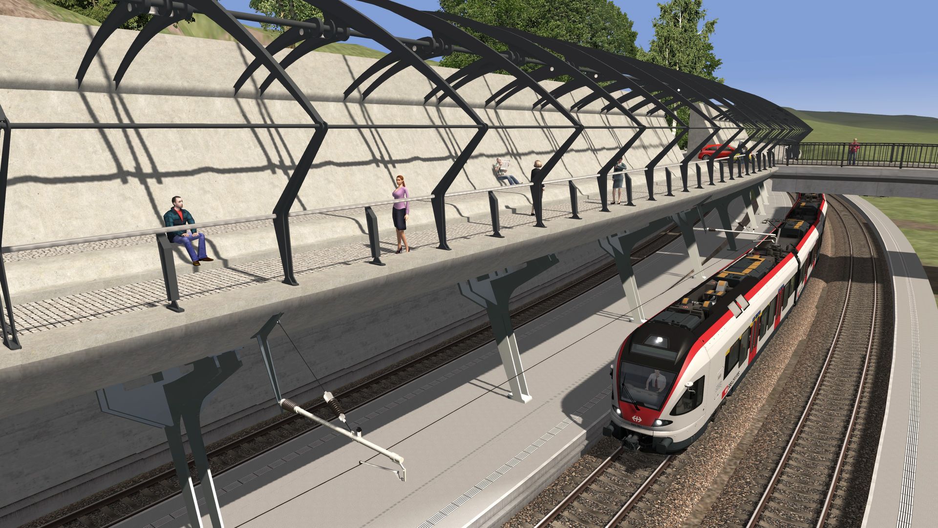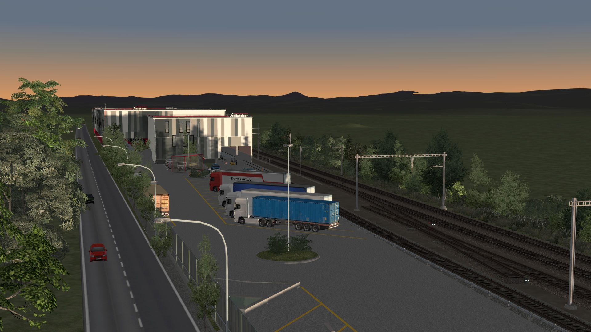 Bilder: Raillogistik-Center der Firma Schönholzer AG in Märstetten. Schönholzer ist eine Tochterfirma der bekannteren Planzer Transport AG. Das Logistikcenter weist eine Länge von rund 290 Metern mit einem durchgehenden Hallengleis auf. Hier werden Blockzüge mit Schiebewandwagen entladen bzw. beladen, um dann via Rangierbahnhof Limmattal (Zürich) aufgeteilt und an die weiteren Center der Planzer-Gruppe in der ganzen Schweiz verteilt zu werden. Das Center wird - mit einem Halt auf offener Strecke - Grundlage für spannende Szenarien im TS202x sein.