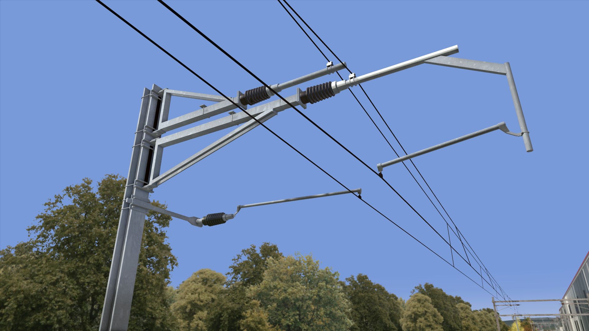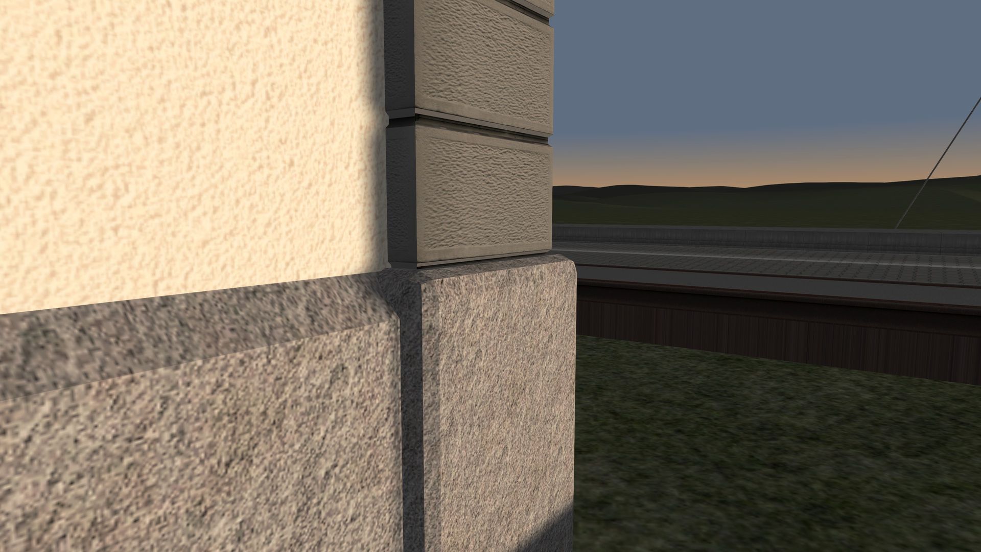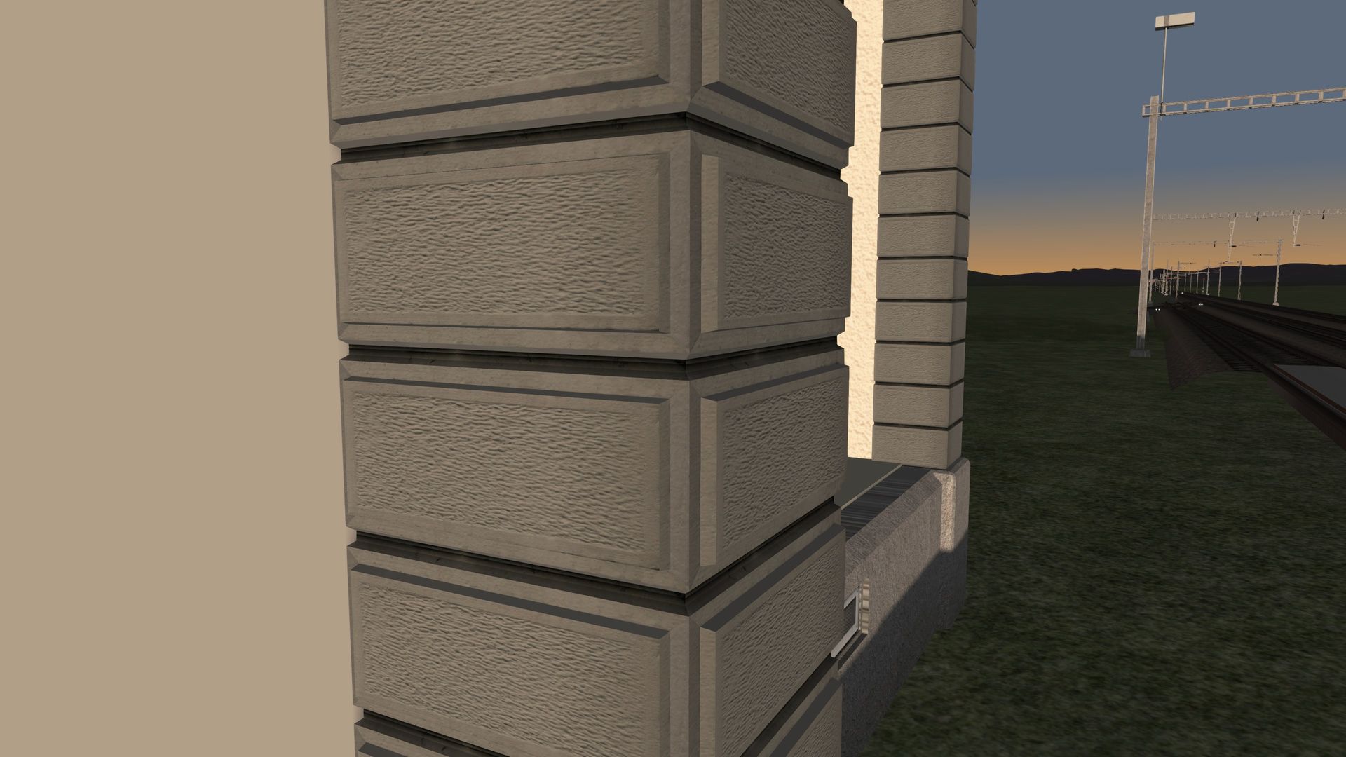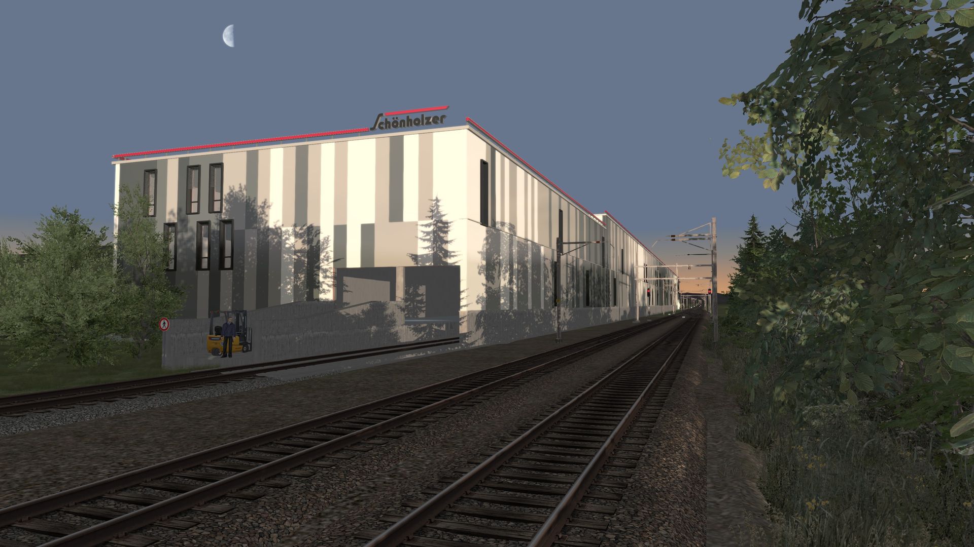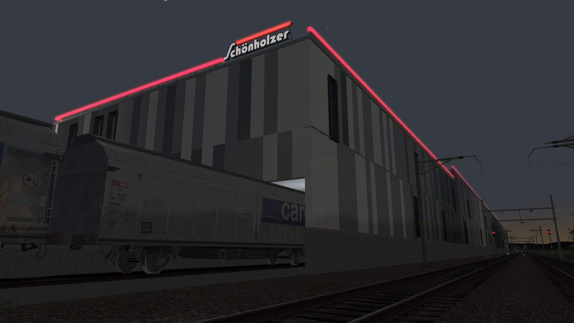 In den letzten Wochen habe ich mich primär der Konstruktion von markanten Gebäuden entlang der Bahnstrecke gewidmet. Enorm viel Zeit hat der "Bau" des obigen Logistikcenters beansprucht. Immerhin ist das gesamte Objekt samt Aussenanlagen rund 500 Meter lang und wurde vollständig mit dem Programm "Blender" konstruiert. Besonders reizvoll an dem attraktiven Industriegebäude isr auch der umlaufende, rote LED-Balken auf dem Dach mit den Originalschriftzügen, welche im Nachtbetrieb von schwarzer Schrift auf Weiss ändern.